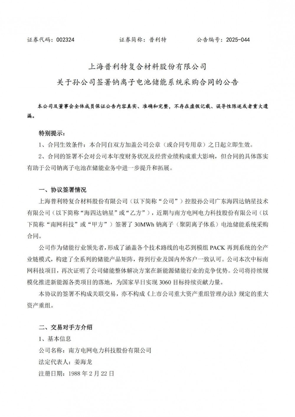 7月8日,普利特发布公告称,公司控股孙公司广东海四达钠星技术有限公司,近期与南方电网电力科技股份有限公司签署了30MWh钠离子(聚阴离子体系)电池储能系统采购合同。