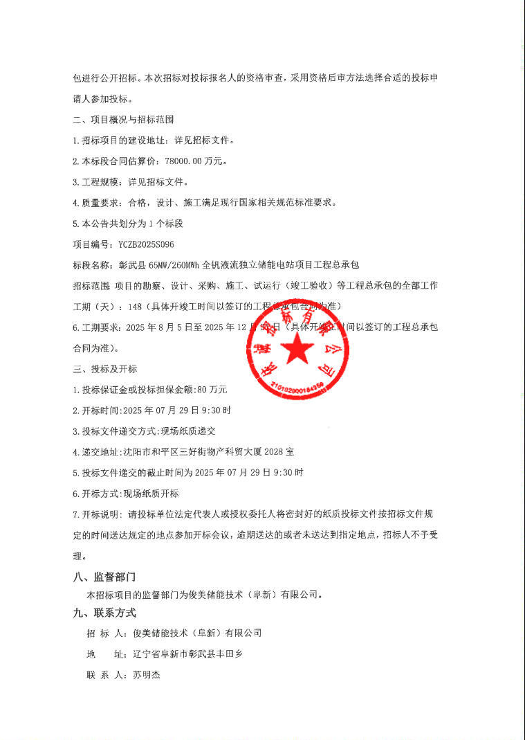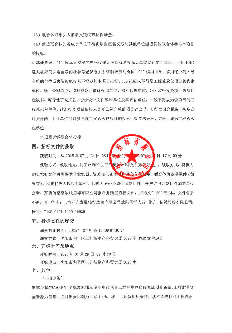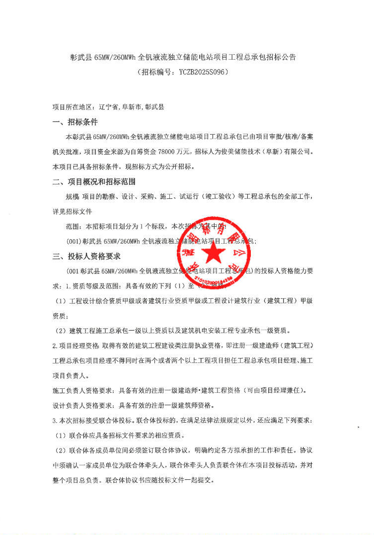 7月8日,彰武县65MW/260MWh全钒液流独立储能电站项目工程总承包招标公告发布。