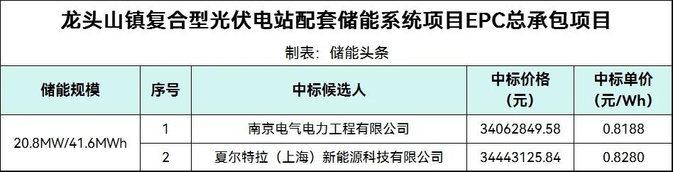 第一中标候选人为南京电气电力工程有限公司,投标报价34062849.58元,折合单价0.8188元/Wh;第二中标候选人为夏尔特拉(上海)新能源科技有限公司,投标报价34443125.84元,折合单价0.8280元/Wh。