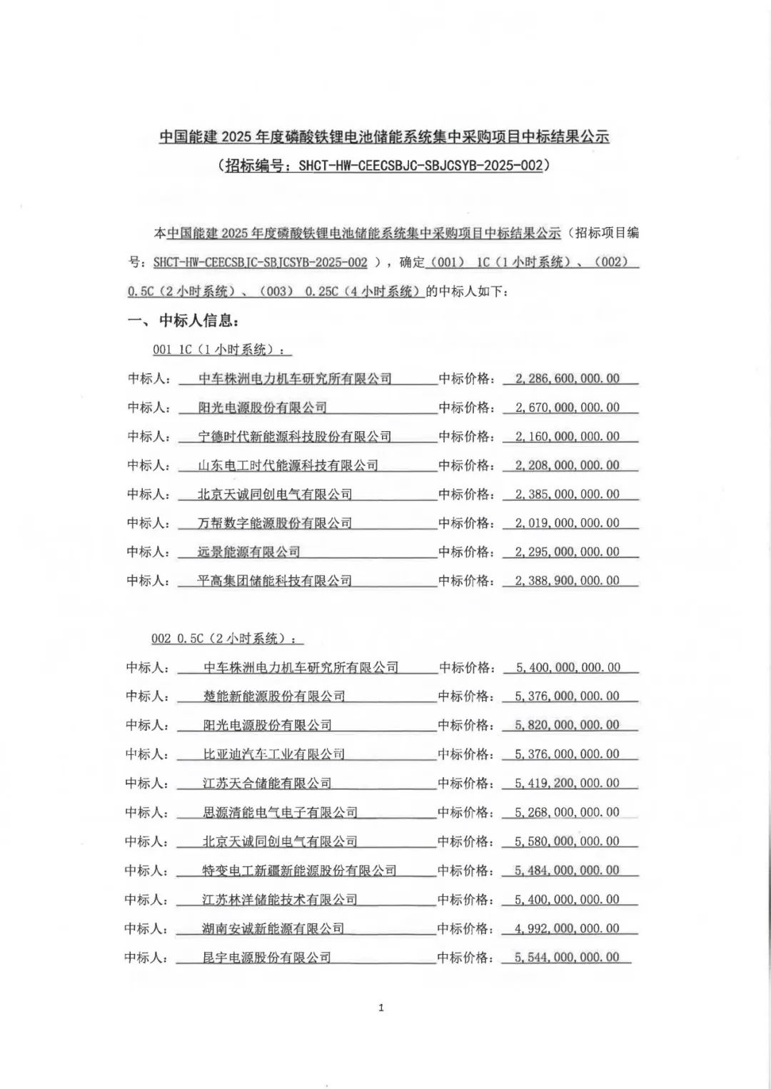 电力家获悉,8月14日,中国能建2025年度磷酸铁锂电池储能系统集中采购项目中标结果。