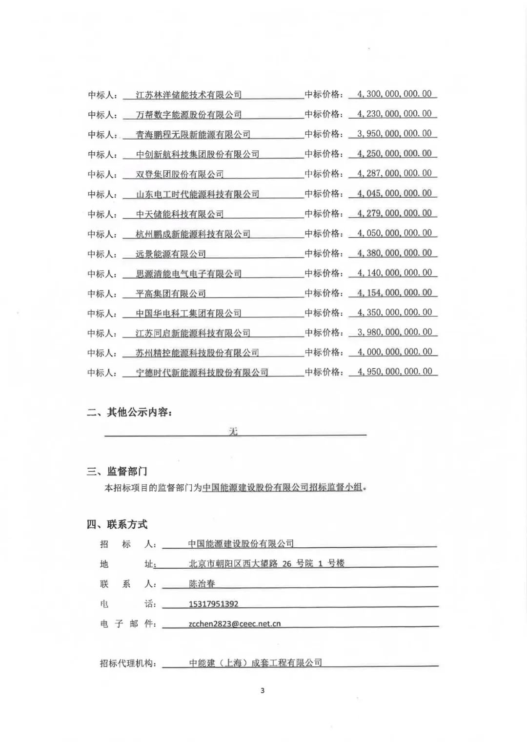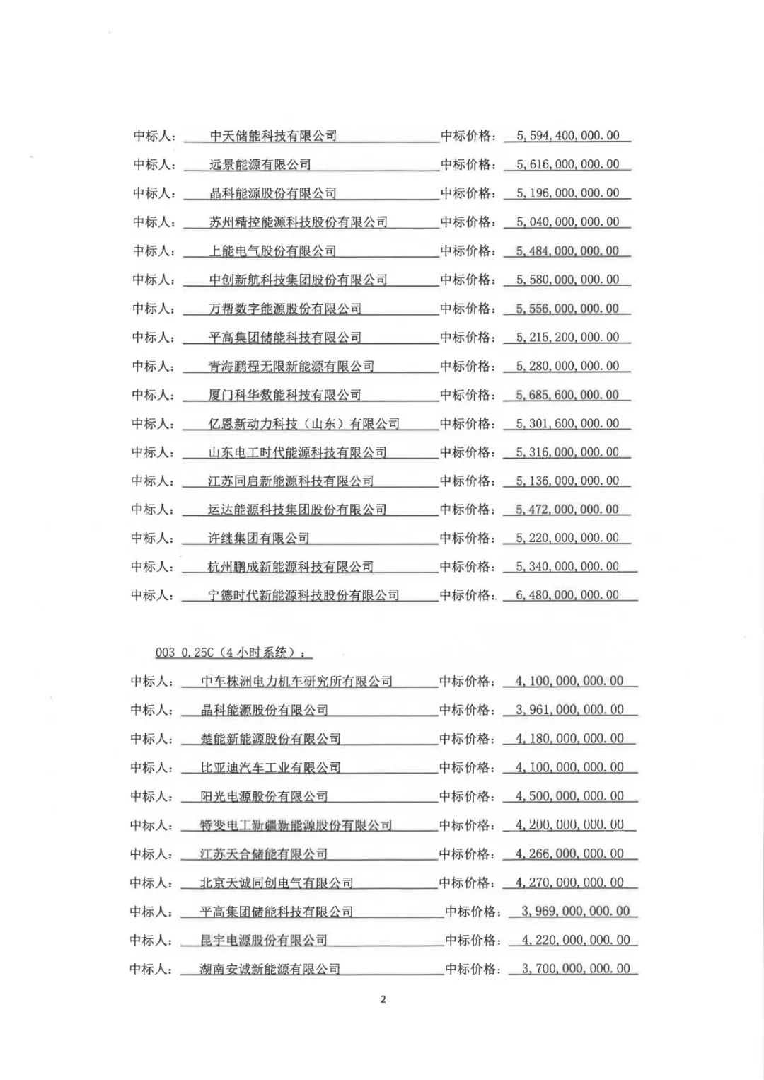 比亚迪、楚能新能源、鹏成新能源、安诚新能源、林洋储能、天合储能、同启新能源、晶科能源、昆宇电源、鹏程无限、思源电气、精控能源、特变电工新能源、中创新航、中天储能15家企业入围两个标段;