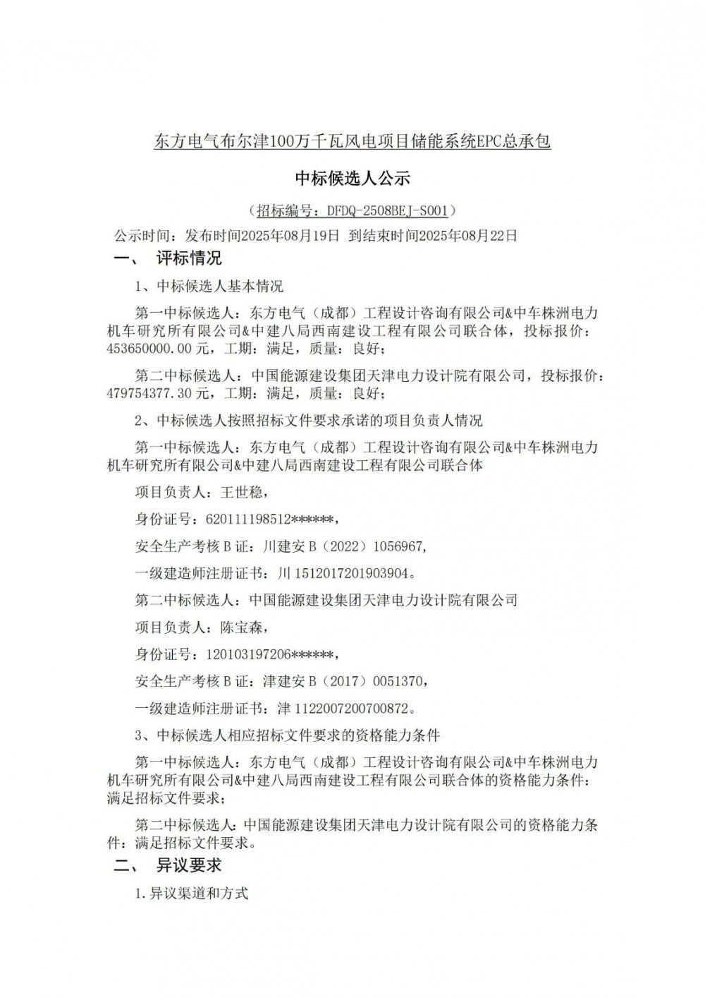 8月19日,东方电气布尔津100万千瓦风电项目储能系统EPC总承包中标候选人公示。