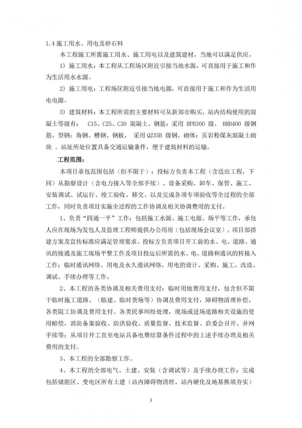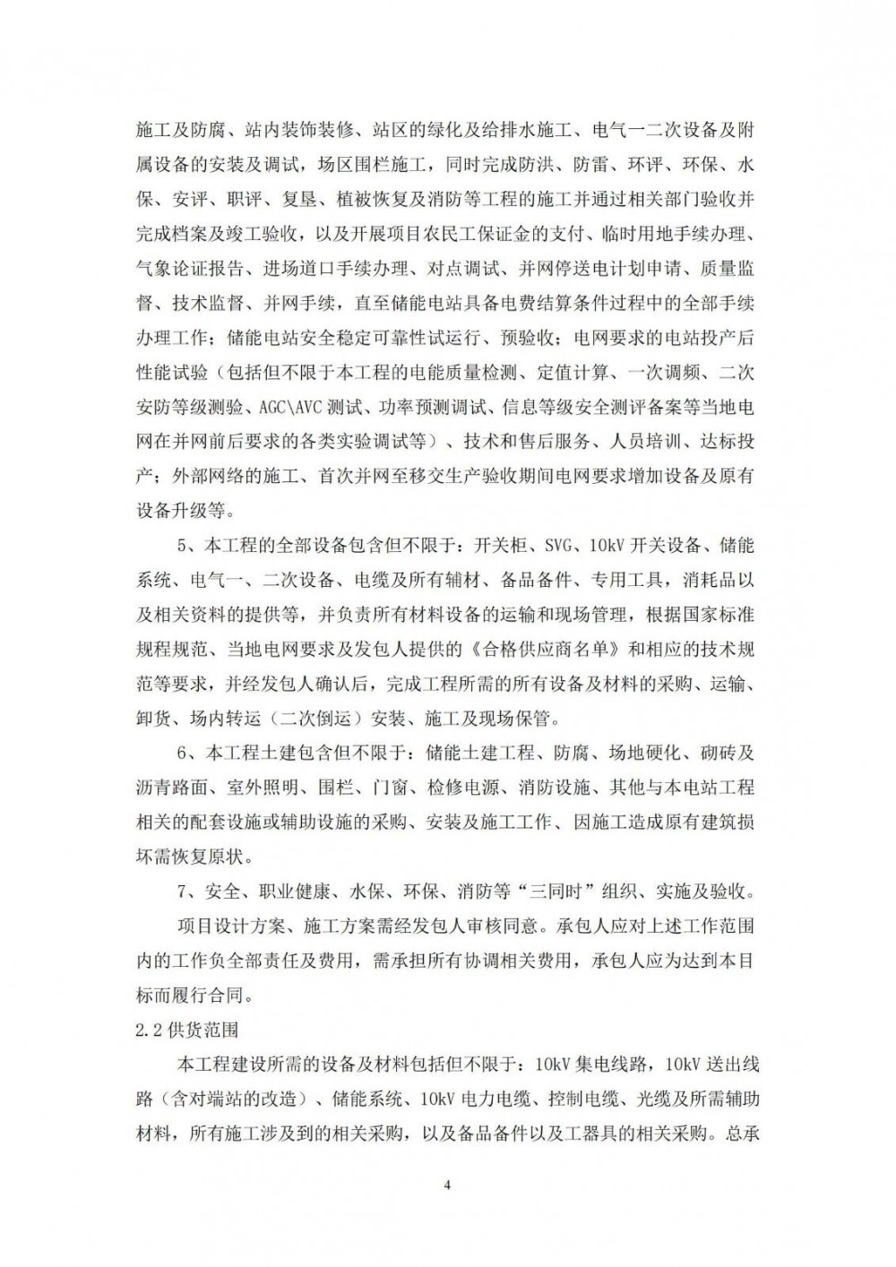 本项目承包范围包括(但不限于):投标方负责本工程(含送出工程)从勘察设计(含电力接入等全部手续)、设备采购、卸车、保管、施工、安装调试、试运行、竣工验收、移交、以及完成各项专项验收等全过程的全部工作,同时负责项目实施全过程的工作协调及相关协调费用的支付。