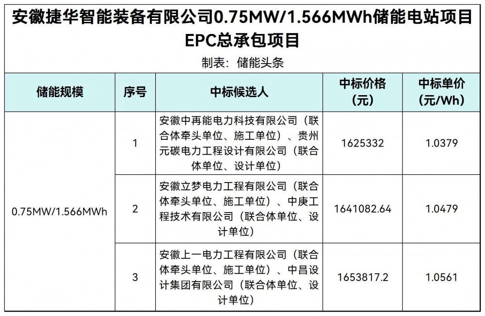 第一中标候选人为安徽中再能电力科技有限公司贵州元碳电力工程设计有限公司联合体,投标报价为1625332元,折合单价1.0379元/Wh;第二中标候选人为安徽立梦电力工程有限公司中庚工程技术有限公司联合体,投标报价为1641082.64元,折合单价1.0479元/Wh;第三中标候选人为安徽上一电力工程有限公司中昌设计集团有限公司联合体,投标报价为1653817.2元,折合单价1.0561元/Wh。
