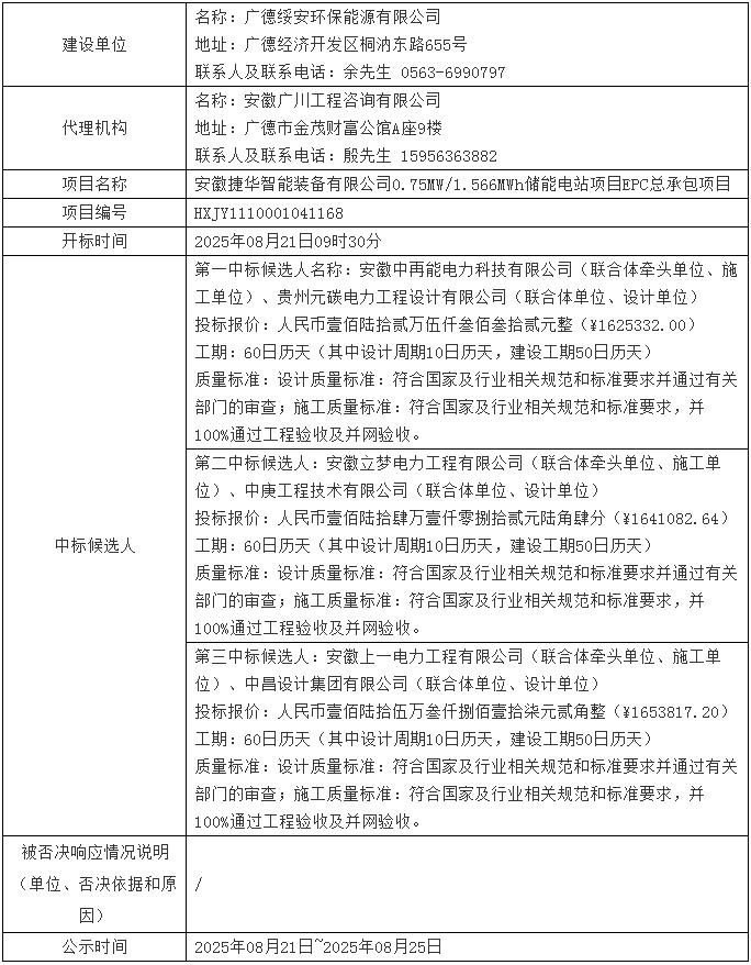 8月21日,安徽捷华智能装备有限公司0.75MW/1.566MWh储能电站项目EPC总承包项目中标候选人公示。