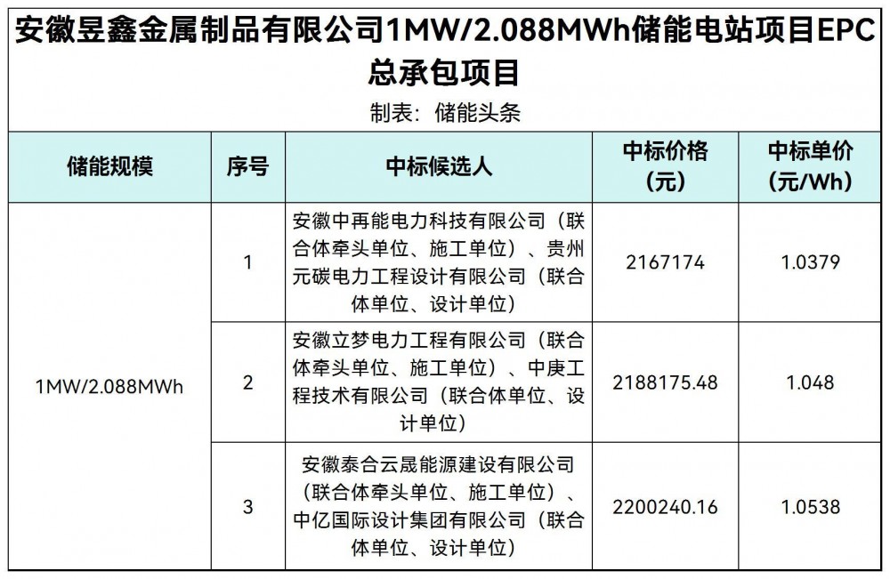 第一中标候选人为安徽中再能电力科技有限公司贵州元碳电力工程设计有限公司(联合体单位、设计单位)联合体,投标报价为2167174元,折合单价1.0379元/Wh;第二中标候选人为安徽立梦电力工程有限公司中庚工程技术有限公司(联合体单位、设计单位)联合体,投标报价为2188175.48元,折合单价1.048元/Wh;第三中标候选人为安徽泰合云晟能源建设有限公司中亿国际设计集团有限公司(联合体单位、设计单位)联合体,投标报价为2200240.16元,折合单价1.0538元/Wh。