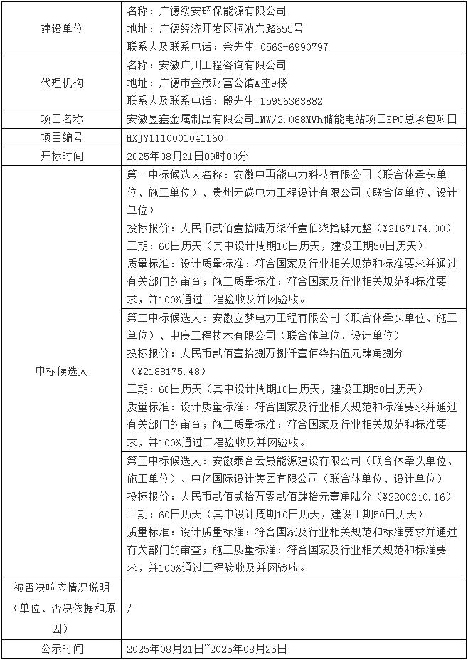 8月21日,安徽昱鑫金属制品有限公司1MW/2.088MWh储能电站项目EPC总承包项目中标候选人公示。