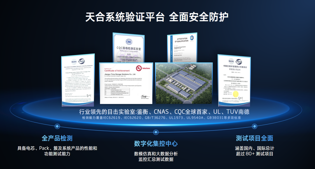 目前,天合储能已获得包括鉴衡、T?V南德、UL、CQC等多个国际主流认证机构的目击实验室资质。面对行业快速发展,天合储能精准捕捉市场革新趋势和潜在需求,以卓越的全栈自研技术能力为客户创造更高价值。公司依托严苛的国际标准对储能产品进行全生命周期管理,严格满足全球所有主要市场的安全法规要求,持续赢得全球客户认可。