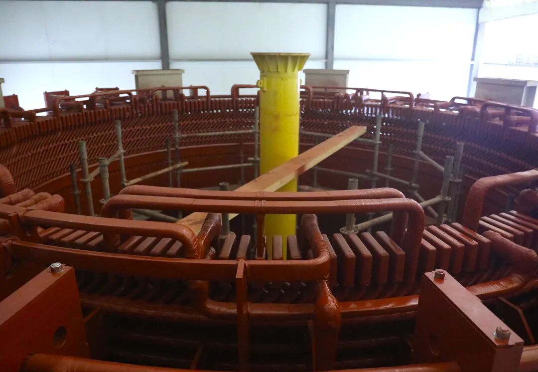 自首台定子组装工作自启动以来,项目部科学统筹资源配置,优化施工工艺。面对工期紧、交叉作业等挑战,项目部全程加强质量管控,大幅提升安装精度与效率,圆满完成了首台1号定子铁心叠装、磁化试验、下层、上层线棒嵌装及耐压等工作。