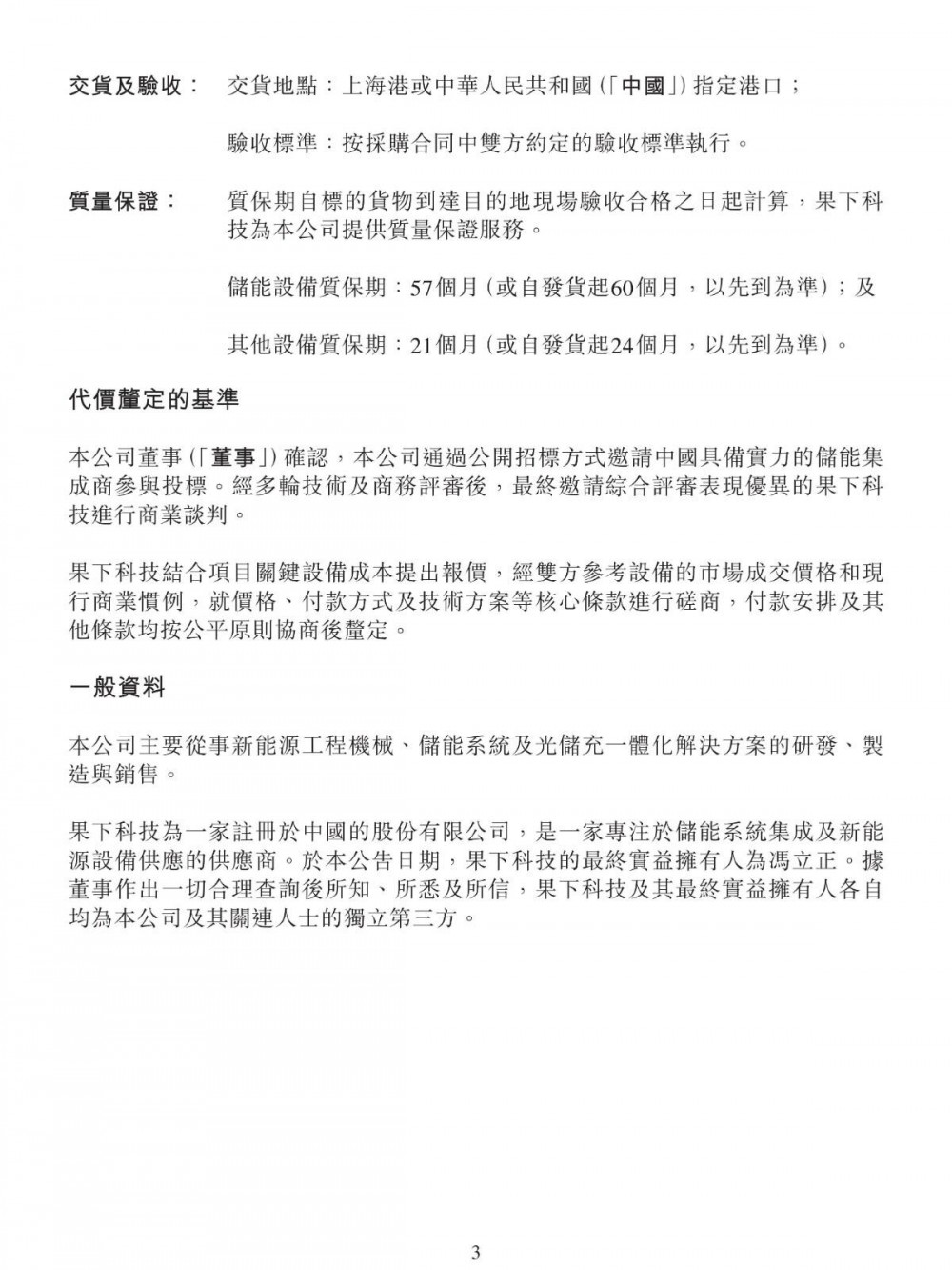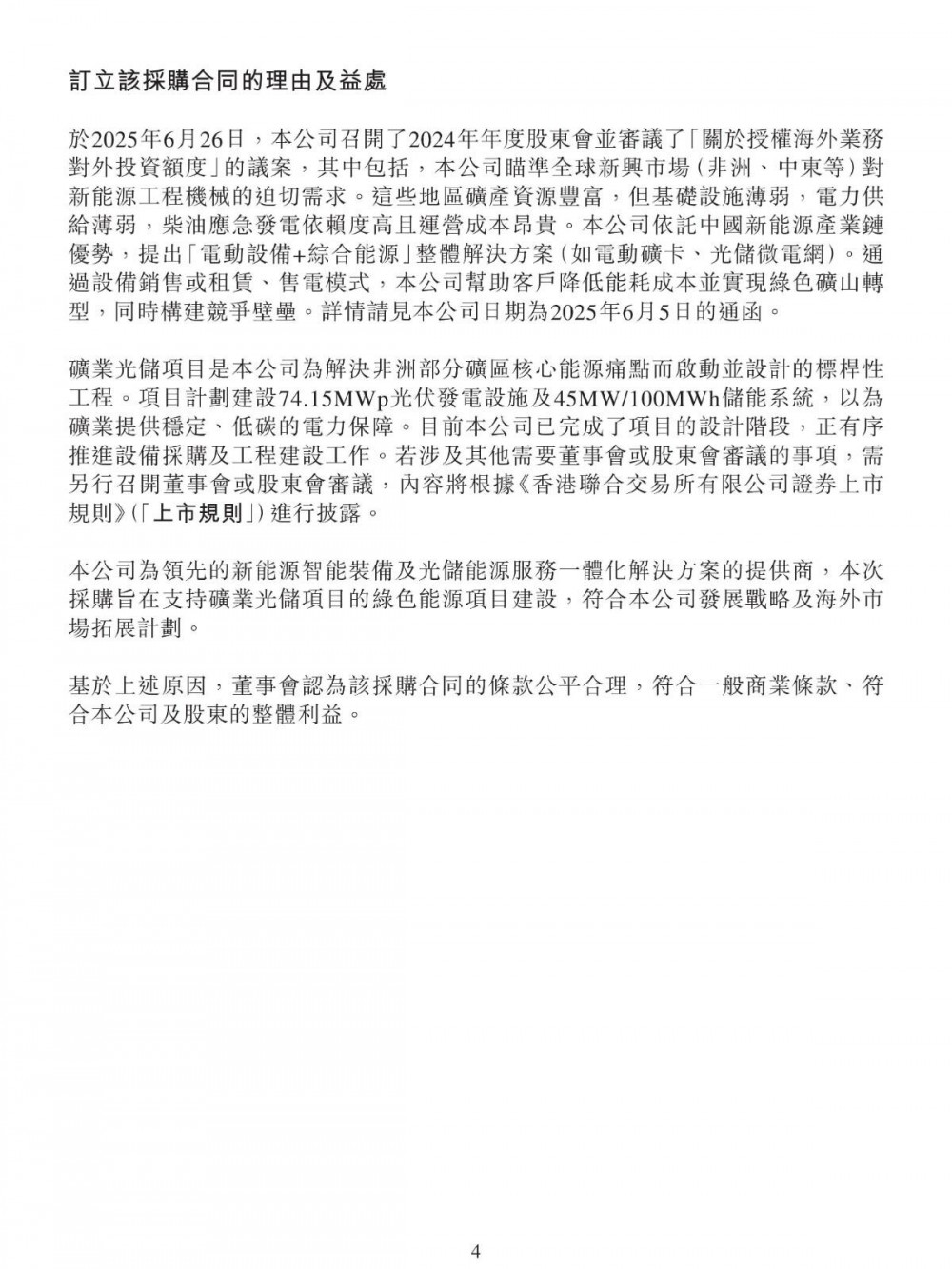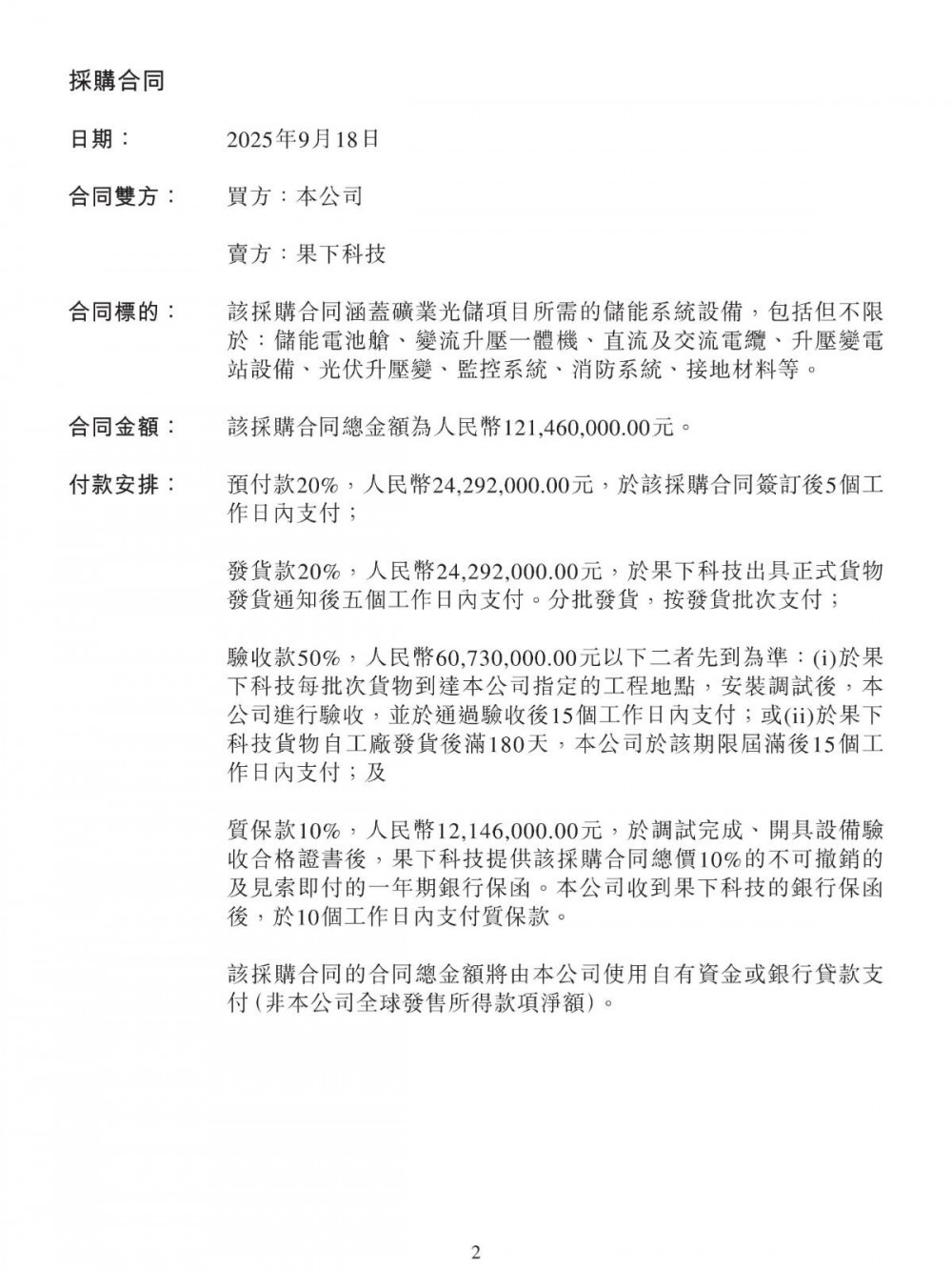 近日,博雷顿发布公告称,公司作为买方与果下科技(作为卖方)订立了一份储能系统设备采购合同,内容有关矿业光储项目储能系统设备的采购、交付及配套服务。该采购合同总金额为人民币1.21亿元。