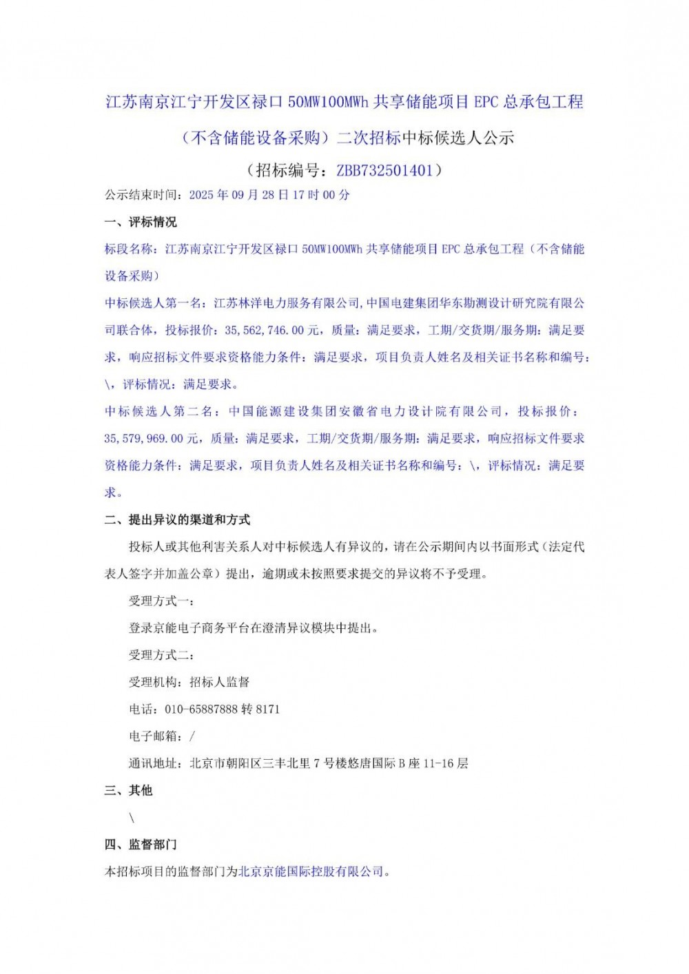 9月25日,江苏南京江宁开发区禄口50MW100MWh共享储能项目EPC总承包工程(不含储能设备采购)二次招标中标候选人公示。