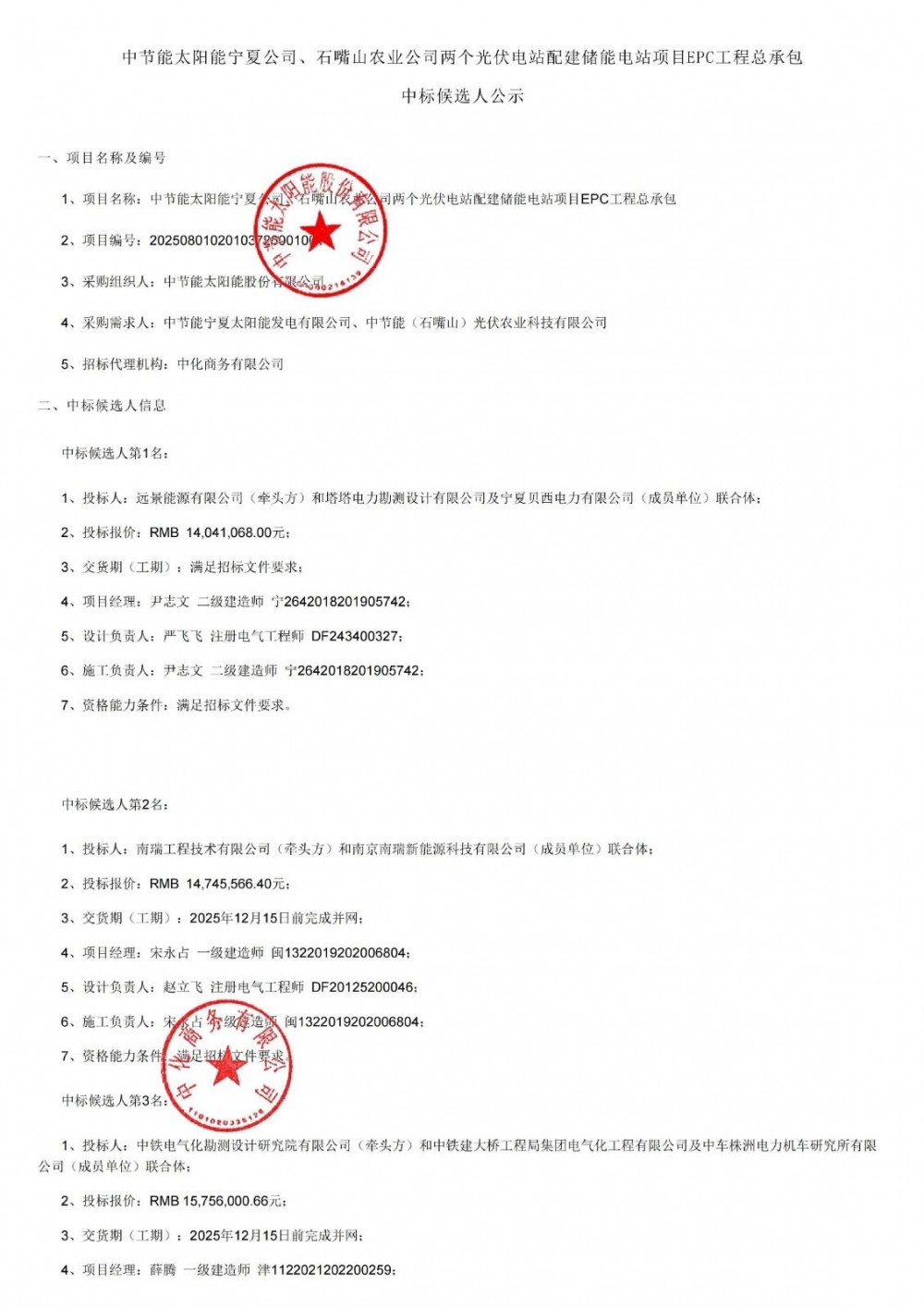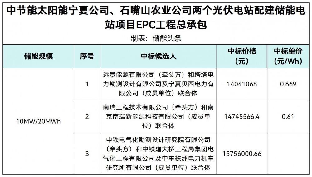 9月28日,中节能太阳能宁夏公司、石嘴山农业公司两个光伏电站配建储能电站项目EPC工程总承包中标候选人公示。