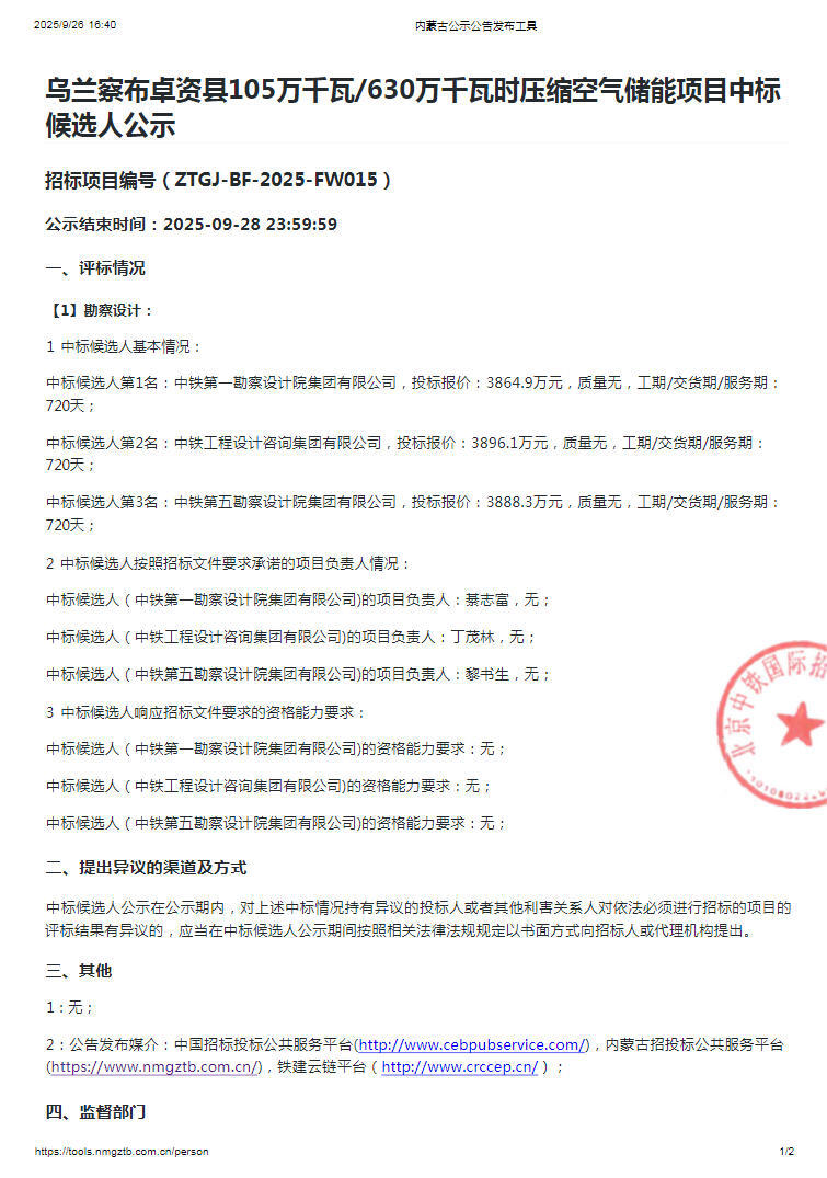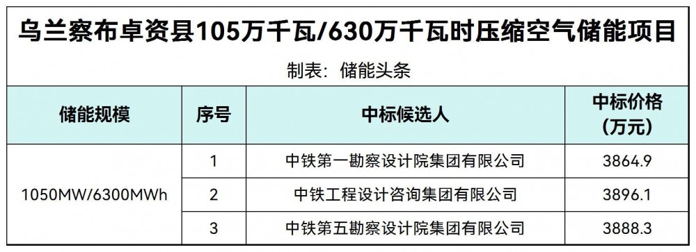 9月28日,乌兰察布卓资县105万千瓦/630万千瓦时压缩空气储能项目中标候选人公示。