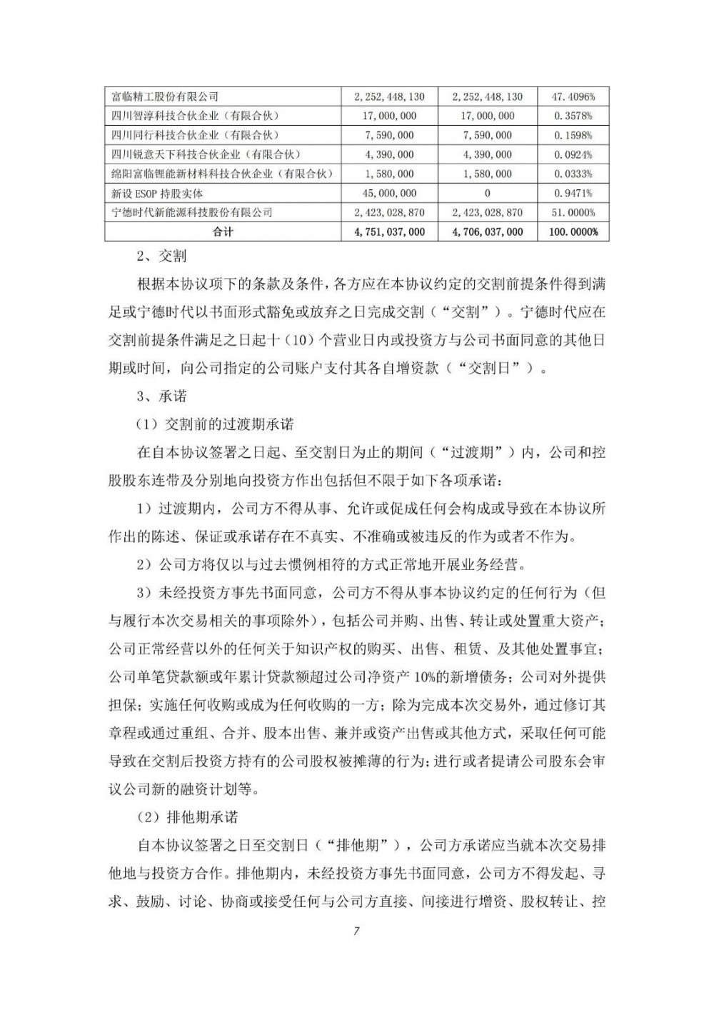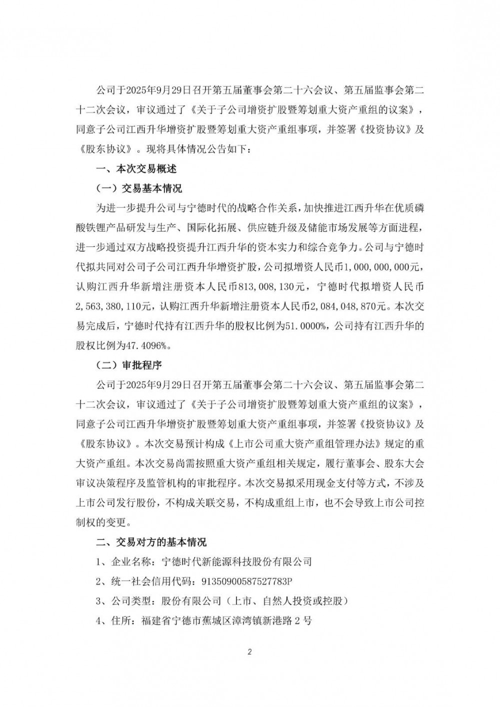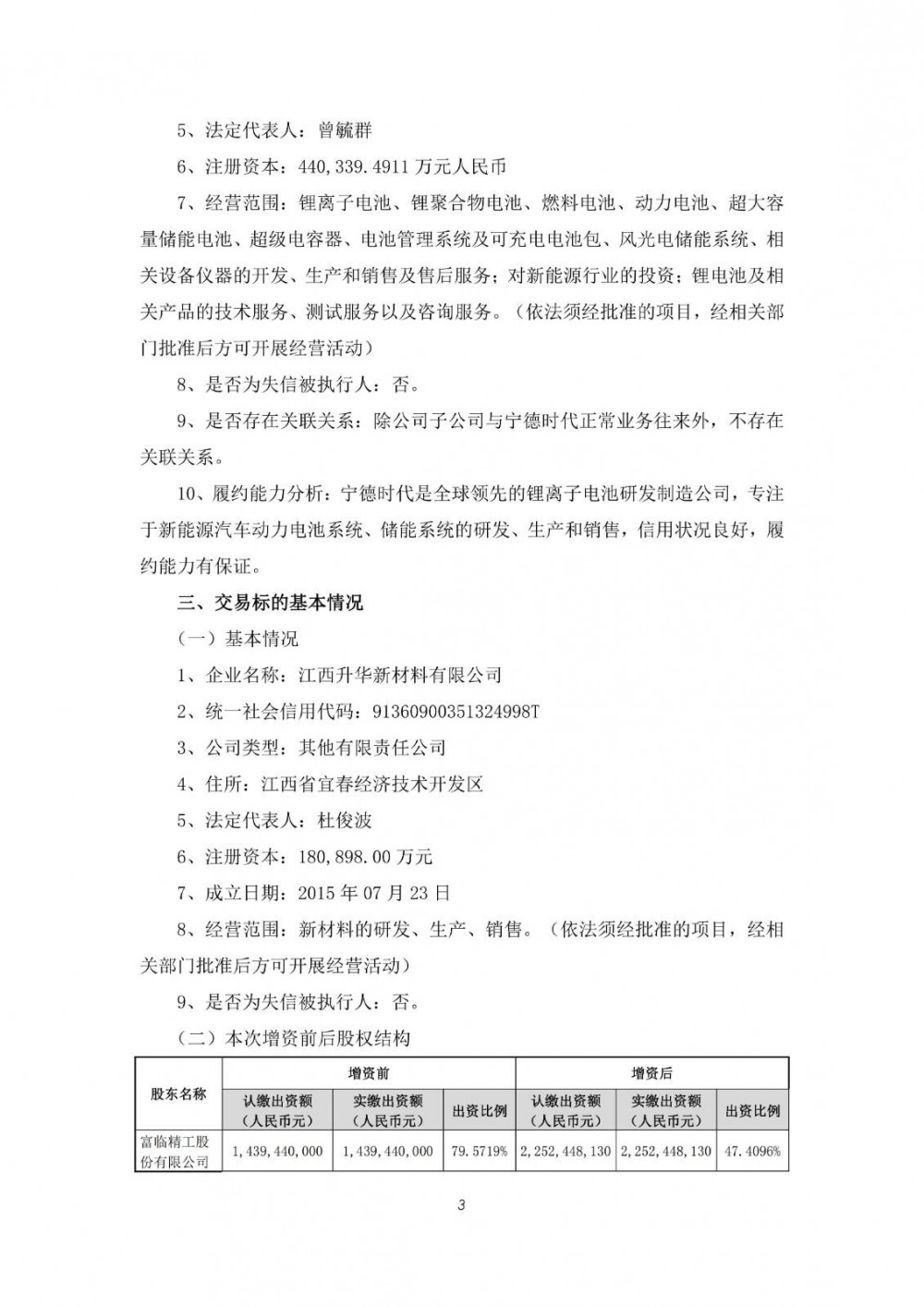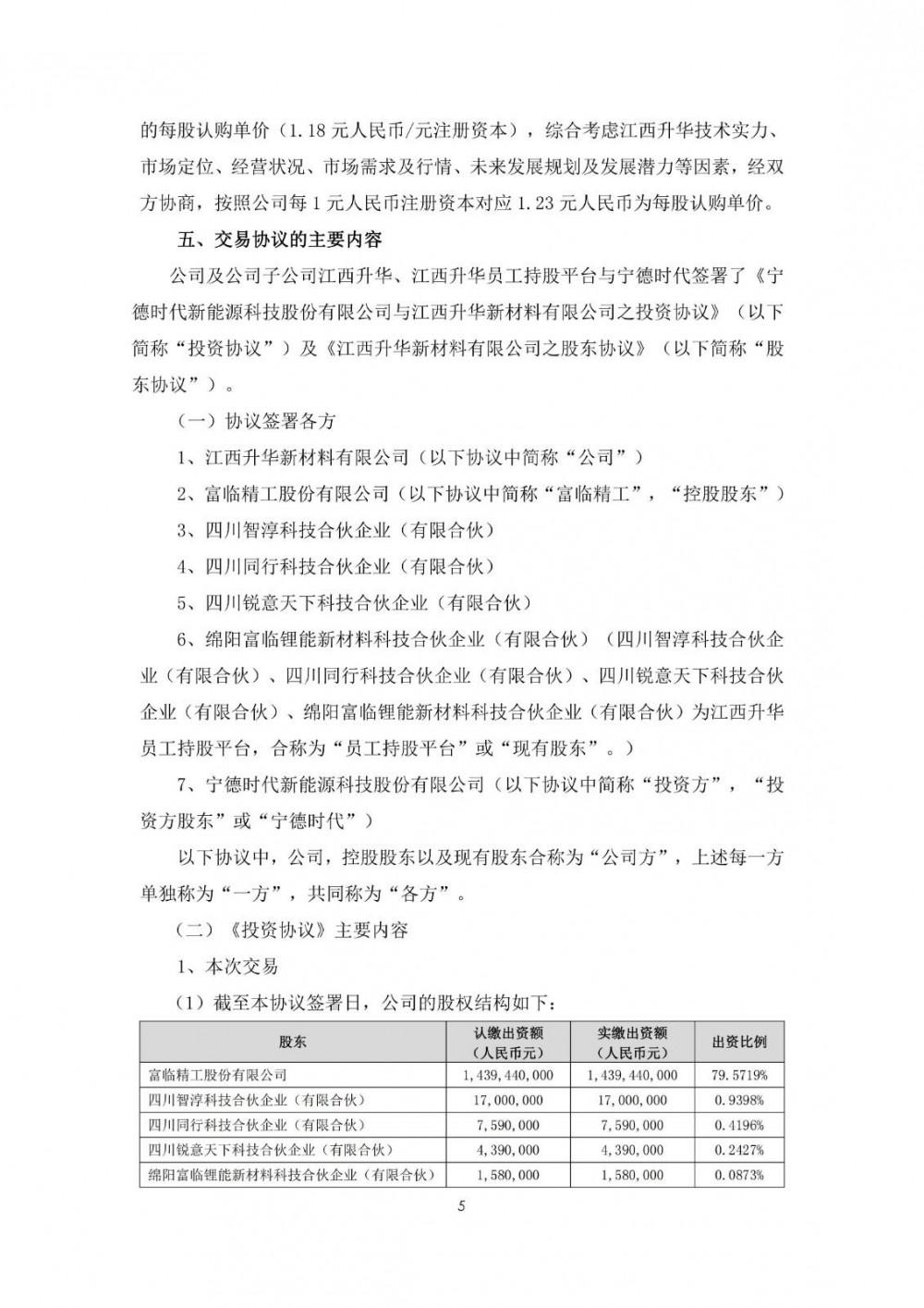 9月29日,富临精工发布公告,为进一步提升公司与宁德时代的战略合作关系,加快推进江西升华在优质磷酸铁锂产品研发与生产、国际化拓展、供应链升级及储能市场发展等方面进程,公司与宁德时代拟共同对公司子公司江西升华增资扩股,公司拟增资人民币10亿元,认购江西升华新增注册资本人民币8.13亿元,宁德时代拟增资人民币25.63亿元,认购江西升华新增注册资本人民币20.84亿元。本次交易完成后,宁德时代持有江西升华的股权比例为51%,公司持有江西升华的股权比例为47.4096%。