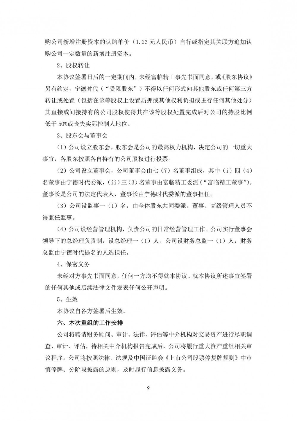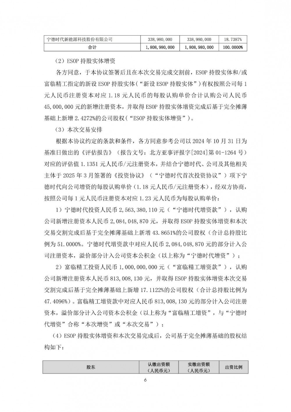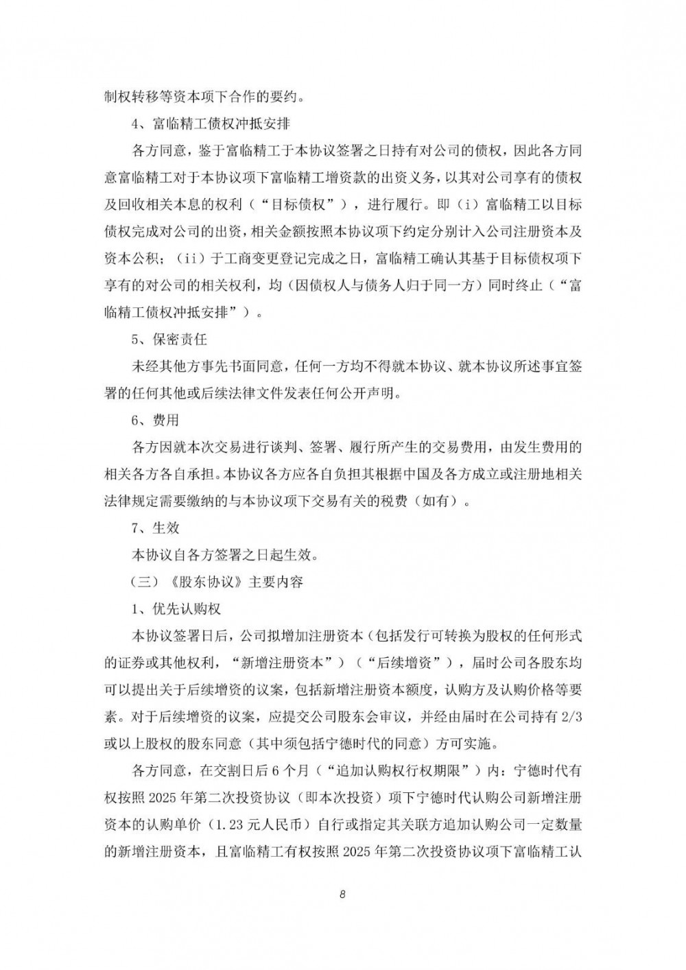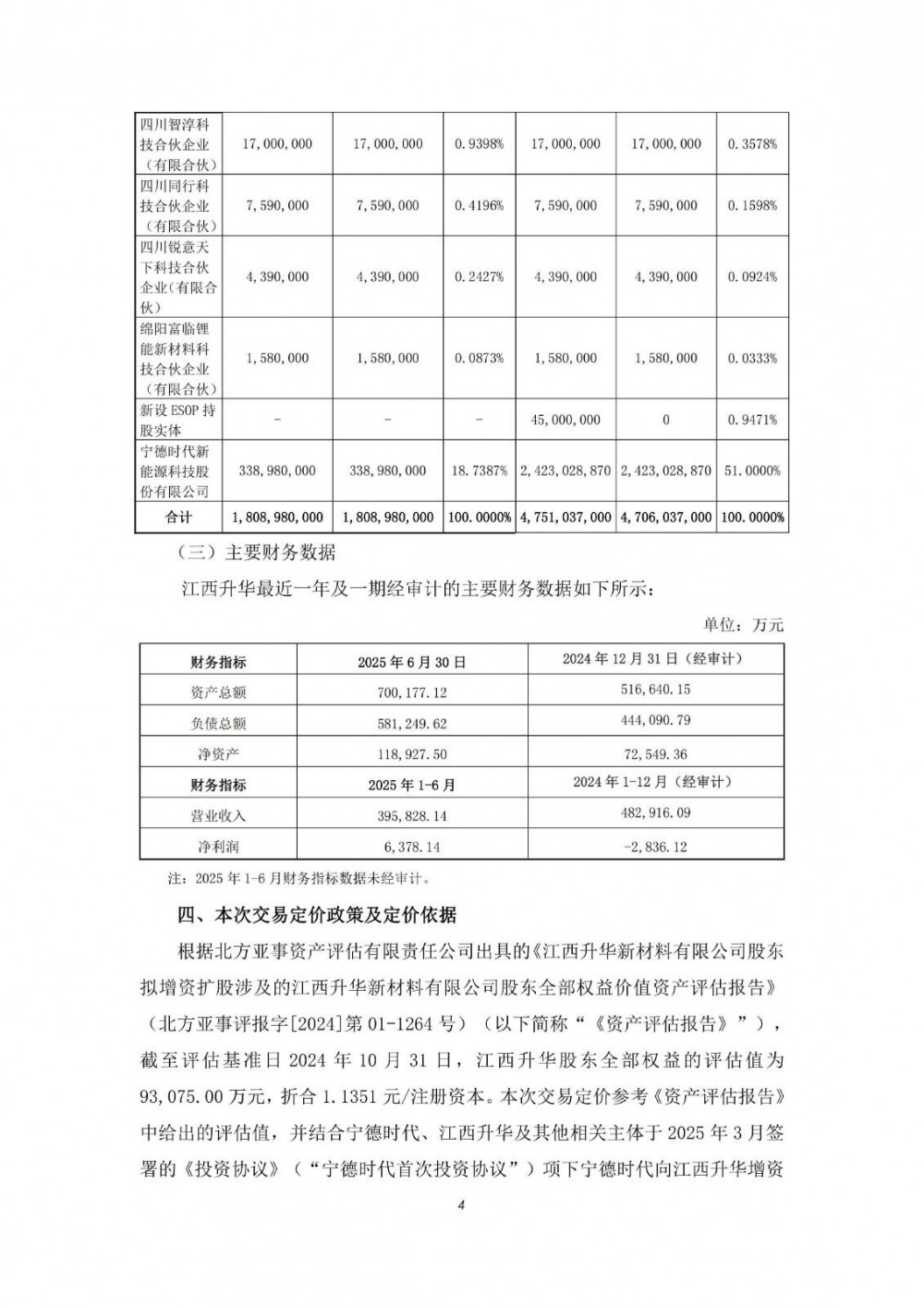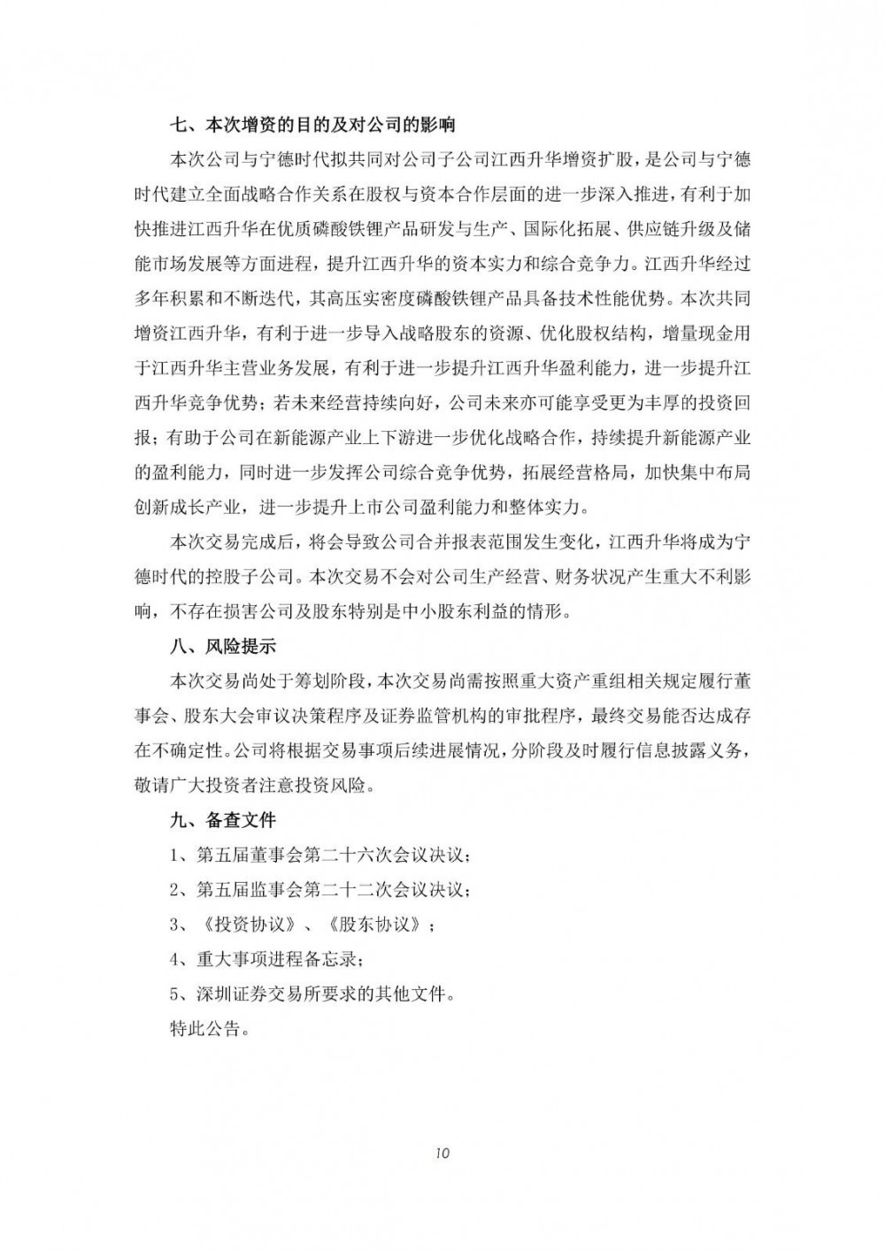 9月29日,富临精工发布公告,为进一步提升公司与宁德时代的战略合作关系,加快推进江西升华在优质磷酸铁锂产品研发与生产、国际化拓展、供应链升级及储能市场发展等方面进程,公司与宁德时代拟共同对公司子公司江西升华增资扩股,公司拟增资人民币10亿元,认购江西升华新增注册资本人民币8.13亿元,宁德时代拟增资人民币25.63亿元,认购江西升华新增注册资本人民币20.84亿元。本次交易完成后,宁德时代持有江西升华的股权比例为51%,公司持有江西升华的股权比例为47.4096%。