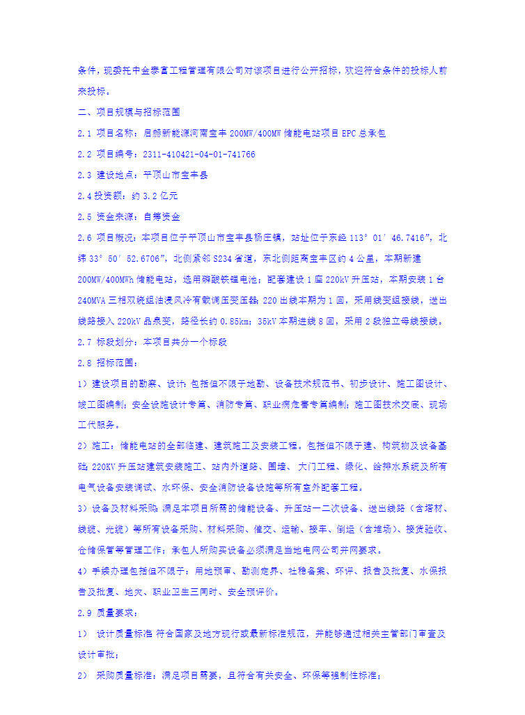10月20日,启赫新能源河南宝丰200MW/400MWh储能电站项目EPC总承包招标公告发布。