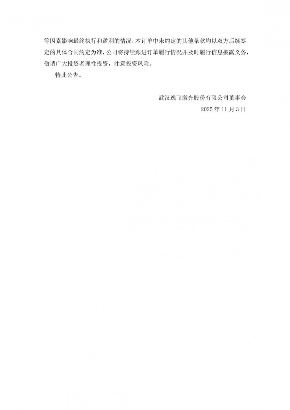 逸飞激光表示,本订单为跨国域执行交付,履行过程中存在因外部宏观环境发生重大变化、国家有关政策变化、客户需求变化、汇率波动变化以及其他不可预见或不可抗力等因素影响最终执行和盈利的情况,本订单中未约定的其他条款均以双方后续签定的具体合同约定为准,公司将持续跟进订单履行情况并及时履行信息披露义务,敬请广大投资者理性投资,注意投资风险。