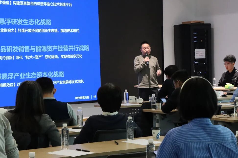在技术交流环节,微控飞轮战略规划部吴帝男基于当前能源与数字变革背景,系统介绍了公司在三大核心方向的业务布局:以飞轮储能破解 AI 算力高频波动难题;以磁浮装备赋能热泵、ORC、空压机在工业领域的高效节能应用;以全生命周期运营方案助力零碳园区建设,展现了微控在零碳技术领域的多元布局。
