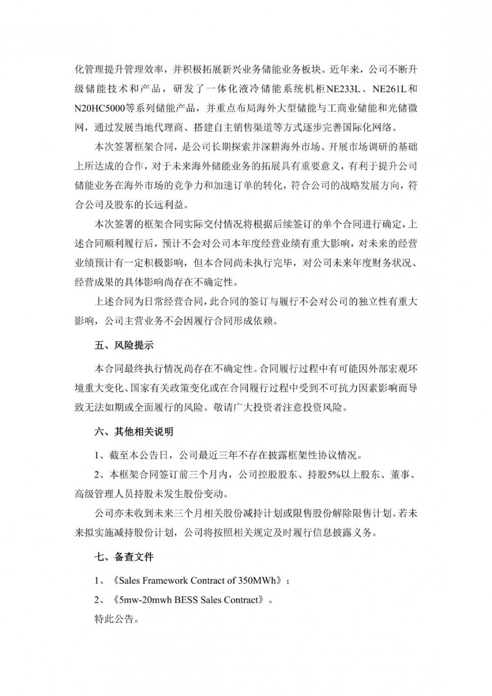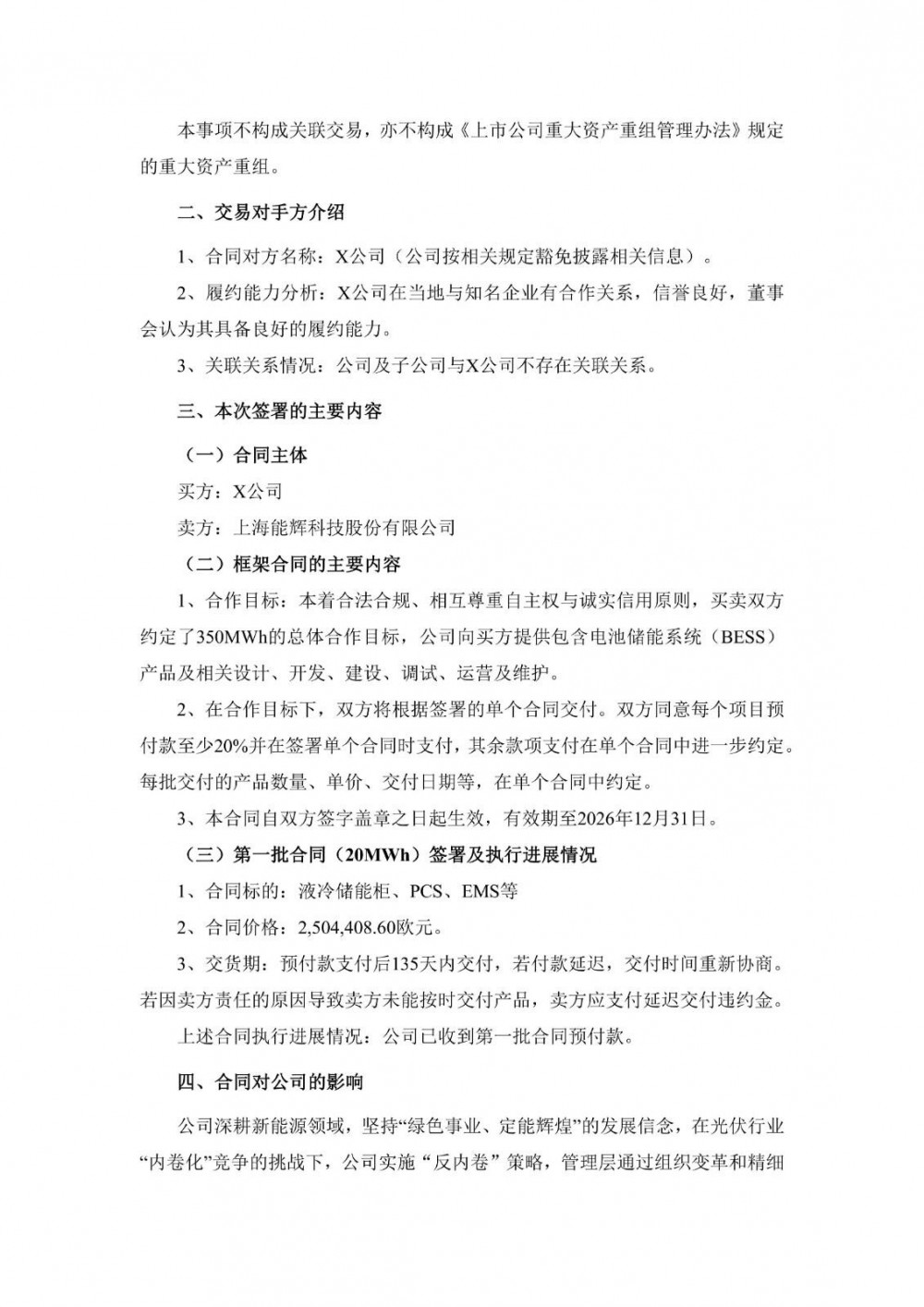 12月8日,能辉科技发布公告称,公司基于海外储能业务的战略布局,公司于近日与海外合作方欧洲某公司签署了350MWh储能框架合同及第一批销售合同,双方约定350MWh合作目标,公司在2026年度向X公司销售包含电池储能系统(BESS)的相关产品。