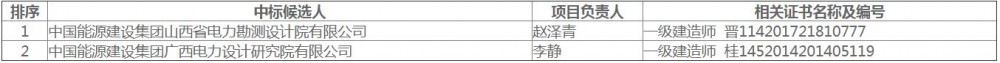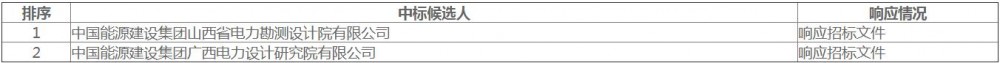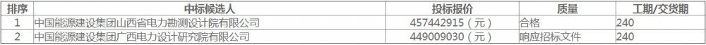 中标候选人第1名为中国能源建设集团山西省电力勘测设计院有限公司,投标报价为457442915元;中标候选人第2名为中国能源建设集团广西电力设计研究院有限公司,投标报价为449009030元。