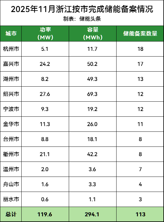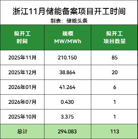 电力家据公开数据不完全统计,2025年11月浙江储能备案项目113个,投资金额9.96亿元,储能备案项目规模119.634MW/294.0825MWh。