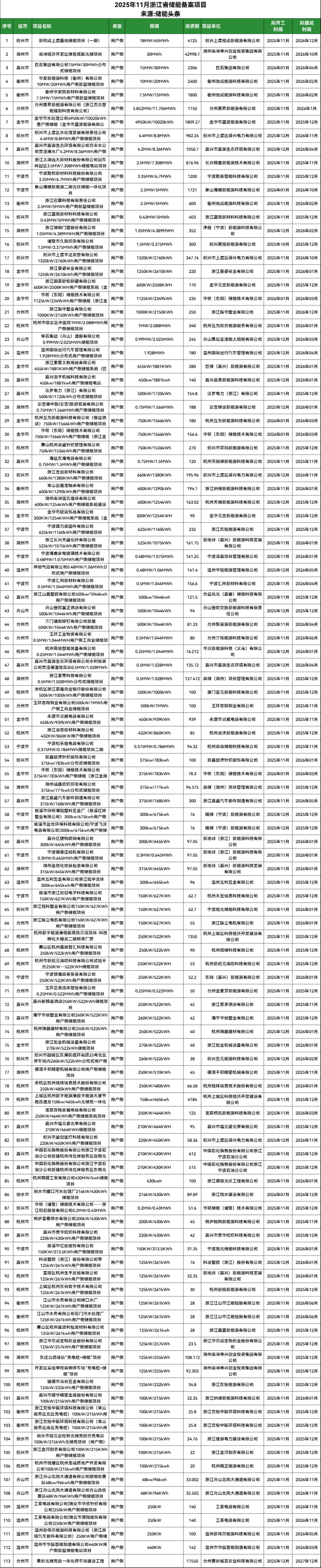 附浙江11月储能备案项目清单: