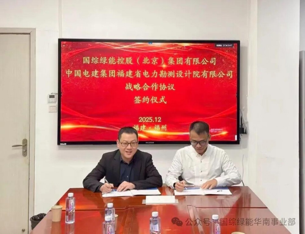12 月9日,国综绿能控股 (北京) 集团有限公司与中国电建集团福建省电力勘测设计院有限公司正式签署战略合作协议书,双方以 “优势互补、合作共赢、共同发展” 为原则,聚焦储能领域深化合作,为福建新能源产业发展与 “双碳” 目标推进注入新动能。