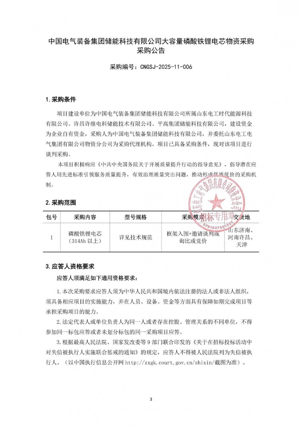 发布时间:2025-12-11 人气: 来源:山东电工物资采购综合管控平台 关键词:中国电气装备集团,磷酸铁锂电芯,平高集团,