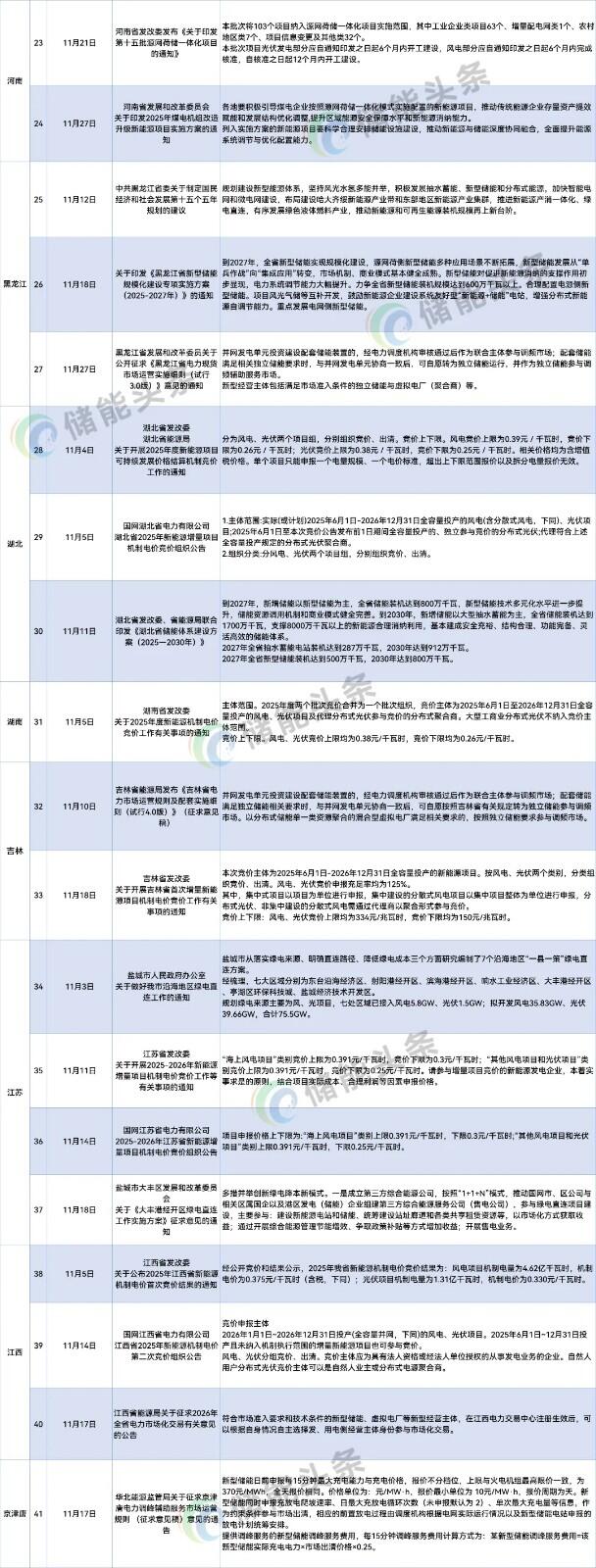 11月18日,吉林省发改委 关于开展吉林省首次增量新能源项目机制电价竞价工作有关事项的通知,本次竞价主体为2025年6月1日-2026年12月31日全容量投产的新能源项目。按风电、光伏两个类别,分类组织竞价、出清。风电、光伏竞价申报充足率均为125%。 其中,集中式项目以项目为单位进行申报,集中建设的分散式风电项目以集中项目整体为单位进行申报,分布式光伏、非集中建设的分散式风电需通过代理商以聚合形式参与竞价。 竞价上下限:风电、光伏竞价上限均为334元/兆瓦时,竞价下限均为150元/兆瓦时。