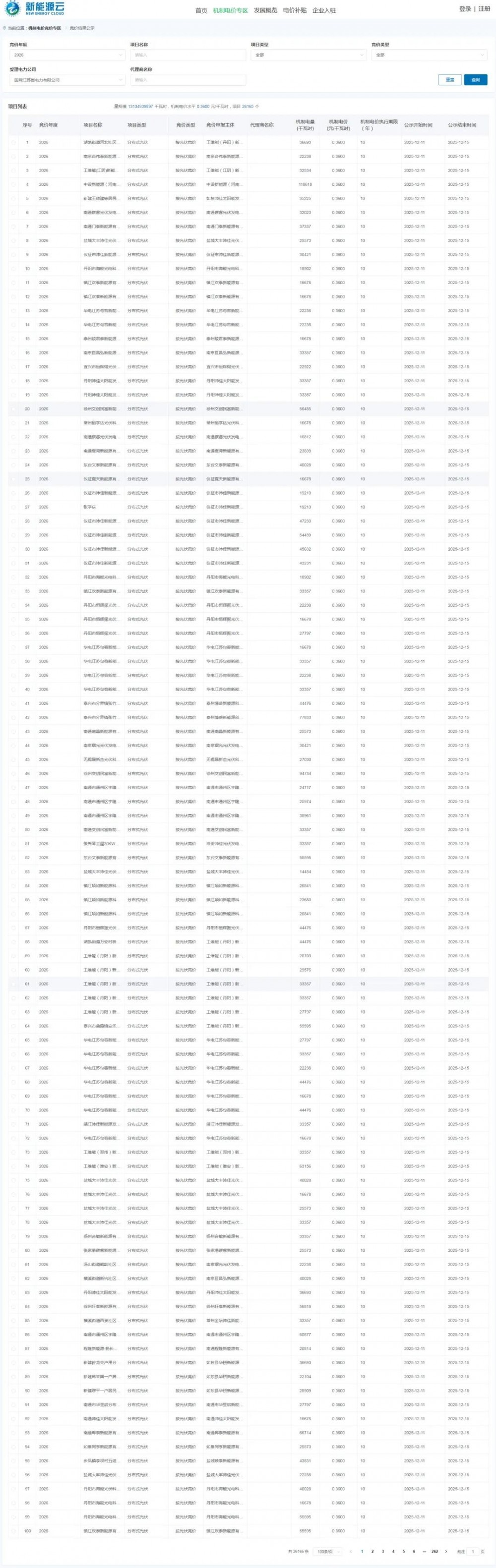 2026年按光伏竞价项目竞价出清结果:机制电量规模13134939897千瓦时,机制电价水平0.3600元/千瓦时,项目26165个。