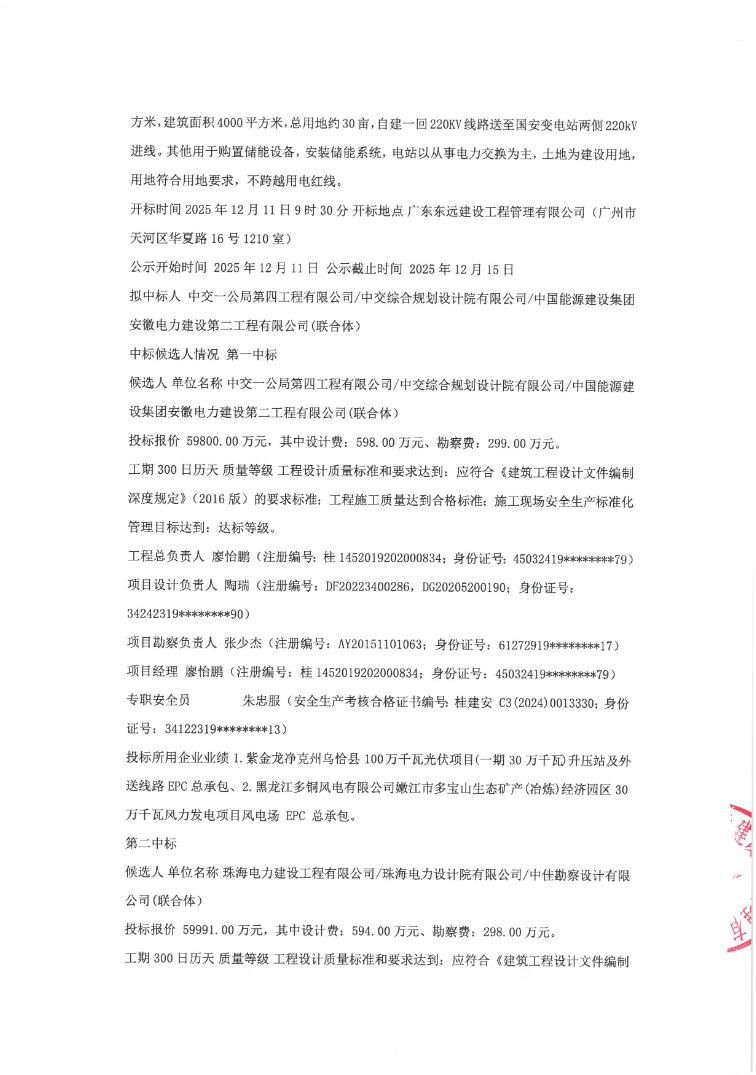 第二中标候选人为珠海电力建设工程有限公司/珠海电力设计院有限公司/中佳勘察设计有限公司(联合体),投标报价59991万元,折合单价1.4998元/Wh;