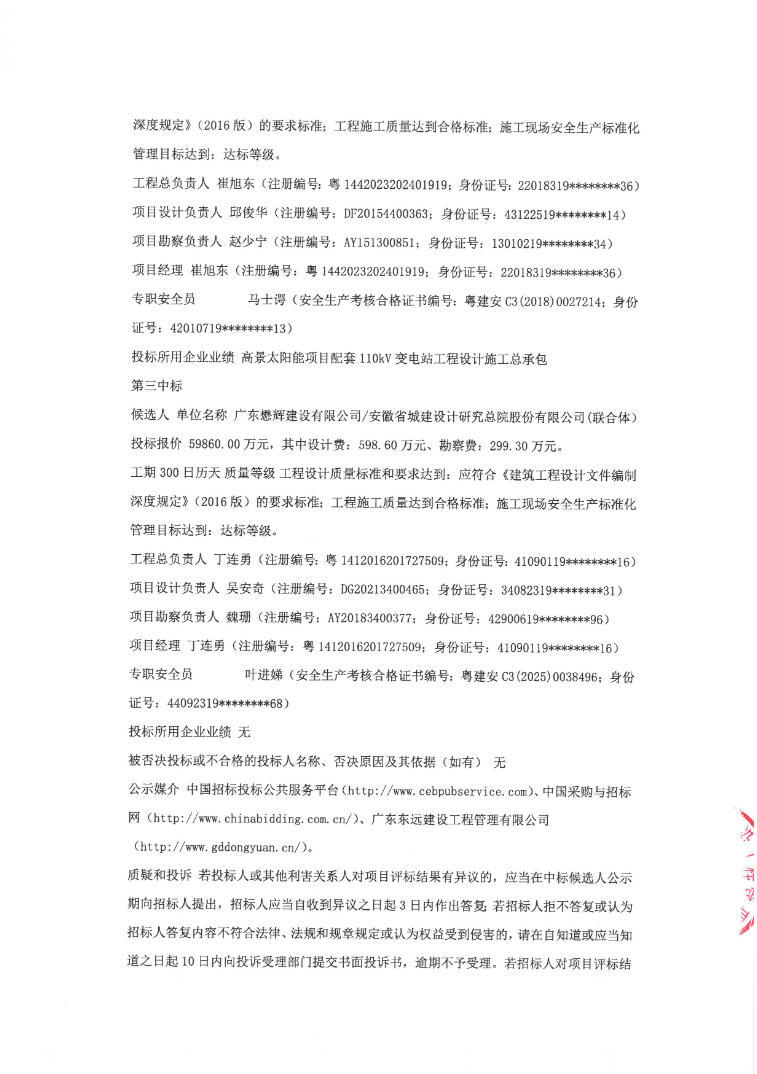 第三中标候选人为广东懋辉建设有限公司/安徽省城建设计研究总院股份有限公司(联合体),投标报价59860万元,折合单价1.4965元/Wh。
