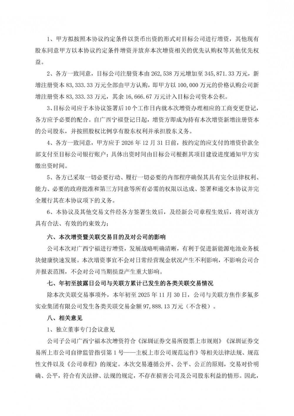 多氟多表示,公司本次对广西宁福进行增资,发展战略明确清晰,有利于促进新能源电池业务板块健康快速发展。本次增资事宜不会对日常经营现金状况产生不利影响,不影响公司合并报表范围,不会对公司当期损益产生重大影响。
