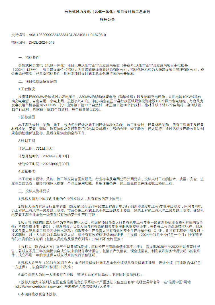 据电力家了解到,5月16日,甘肃庆阳500MW分散式风力发电(风储一体化)项目进行EPC总承包招标。公告显示,除风电部分外,项目还配备330MW的移动储能电池(磷酸铁锂)以及配套充电设施,采用电网10KV线路作为充电电源,自发自用,余电上网。