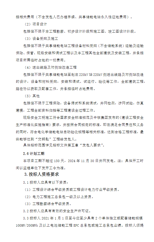 招标范围:新华电力朔州 300MW/600MWh 共享储能电站一期 150MW/300MWh 项目包括一期150MW/300MWh 储能系统施工(不含储能设备系统采购)、新建 220kV 变电站及配套工程、对侧汇集站 220kV 间隔改造及配套 35kV 电容器组改造、送出线路等工程。