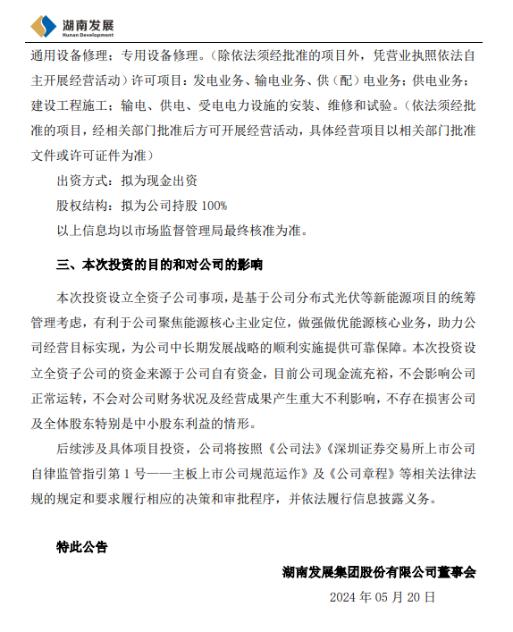 对于成立新能源公司,湖南发展表示,是基于公司分布式光伏等新能源项目的统筹管理考虑,有利于公司聚焦能源核心主业定位,做强做优能源核心业务,助力公司经营目标实现,为公司中长期发展战略的顺利实施提供可靠保障。本次投资设立全资子公司的资金来源于公司自有资金,目前公司现金流充裕,不会影响公司正常运转,不会对公司财务状况及经营成果产生重大不利影响,不存在损害公司及全体股东特别是中小股东利益的情形。