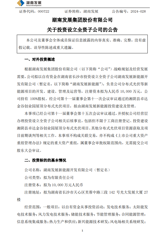 据电力家了解到,5月20日晚,湖南发展发布公告宣布,公司拟以自有资金在湖南省长沙市投资设立全资子公司湖南发展新能源开发有限公司(暂定名,简称“湖南发展新能源”),负责公司分布式光伏等新能源项目的开发、建设、管理及运营等,注册资本拟为人民币 10,000 万元,公司持有 100%股权。