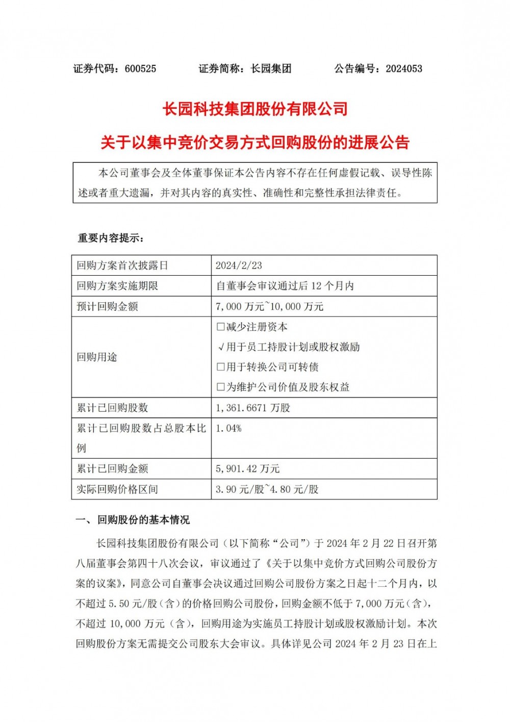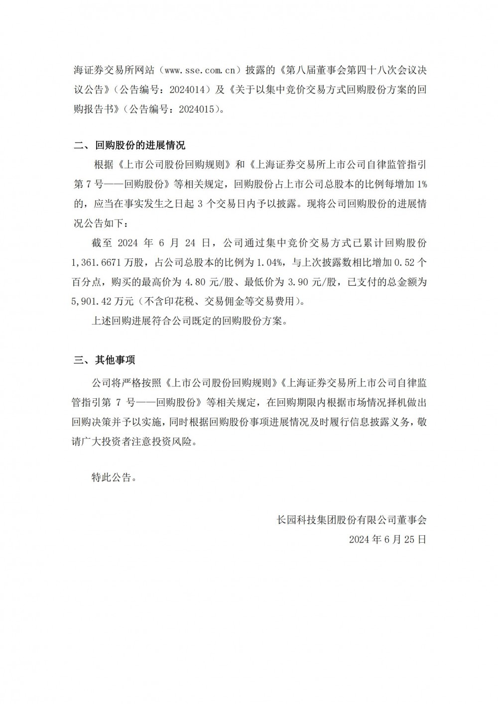 公告显示,截至2024年6月24日,公司通过集中竞价交易方式已累计回购股份1,361.6671万股,占公司总股本的比例为1.04%,与上次披露数相比增加0.52个百分点,购买的最高价为4.80元/股、最低价为3.90元/股,已支付的总金额为5,901.42万元(不含印花税、交易佣金等交易费用)。