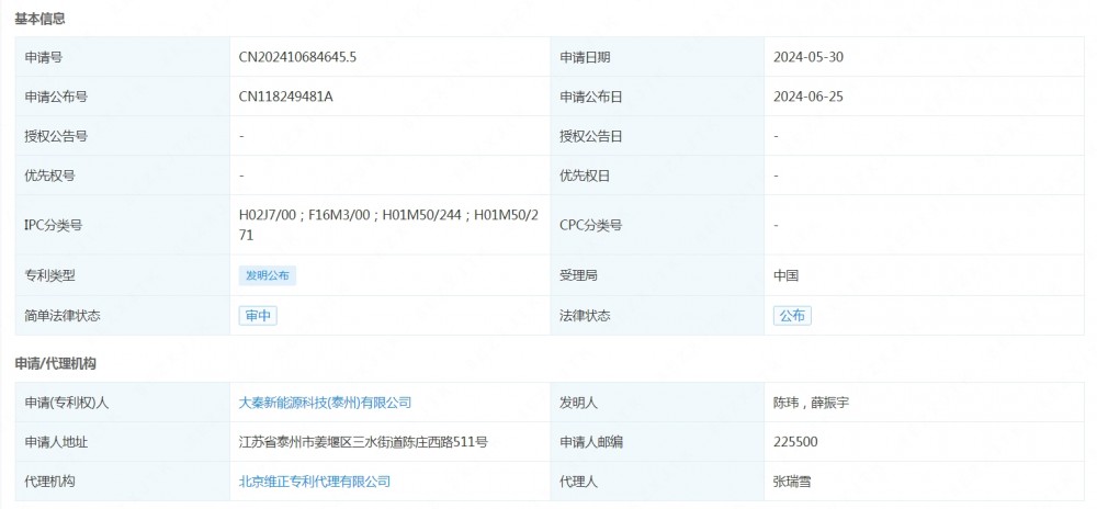 据电力家了解到,企查查显示,大秦新能源科技(泰州)有限公司申请公布一项发明专利,专利名为“一种可移动的储能设备”,专利申请公布号为CN118249481A,申请公布日为2024年6月25日。