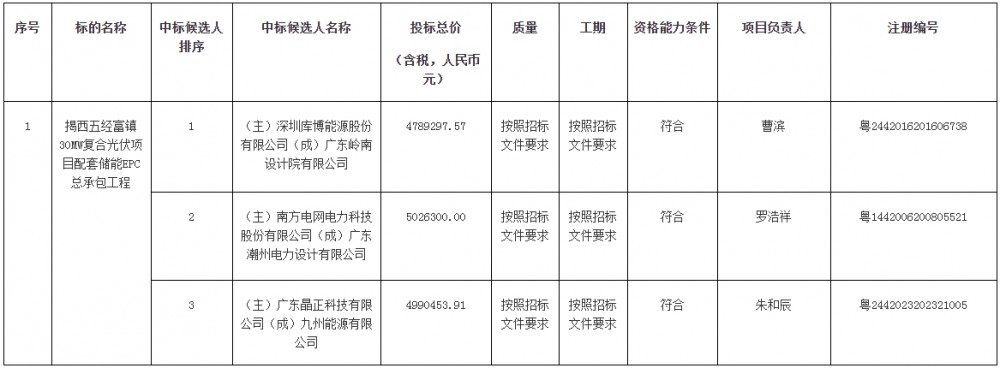 据电力家了解到,近日,揭西五经富镇30MW复合光伏项目配套储能EPC总承包工程中标候选人公示。