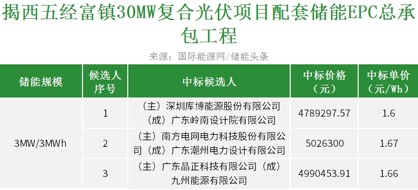 第一中标候选人为(主)深圳库博能源股份有限公司(成)广东岭南设计院有限公司,投标报价4789297.57元,折合单价1.6元/Wh;第二中标候选人为(主)南方电网电力科技股份有限公司(成)广东潮州电力设计有限公司,投标报价5026300元,折合单价1.67元/Wh;第三中标候选人为(主)广东晶正科技有限公司(成)九州能源有限公司,投标报价为4990453.91元,折合单价1.66元/Wh。