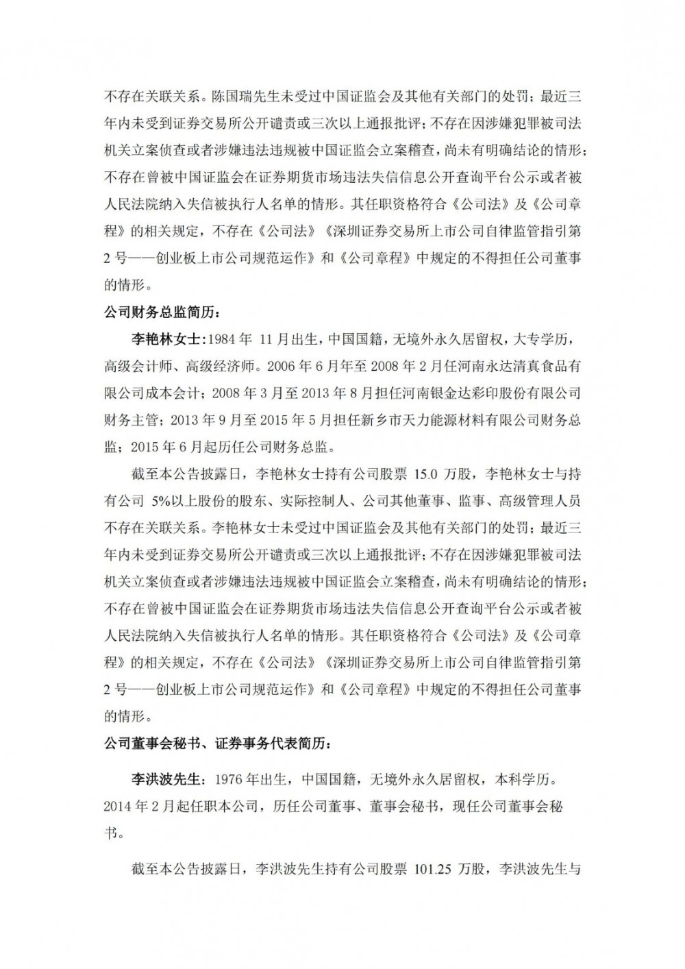 李艳林女士:1984年11月出生,中国国籍,无境外永久居留权,大专学历,高级会计师、高级经济师。2006年6月年至2008年2月任河南永达清真食品有限公司成本会计;2008年3月至2013年8月担任河南银金达彩印股份有限公司财务主管;2013年9月至2015年5月担任新乡市天力能源材料有限公司财务总监;2015年6月起历任公司财务总监。