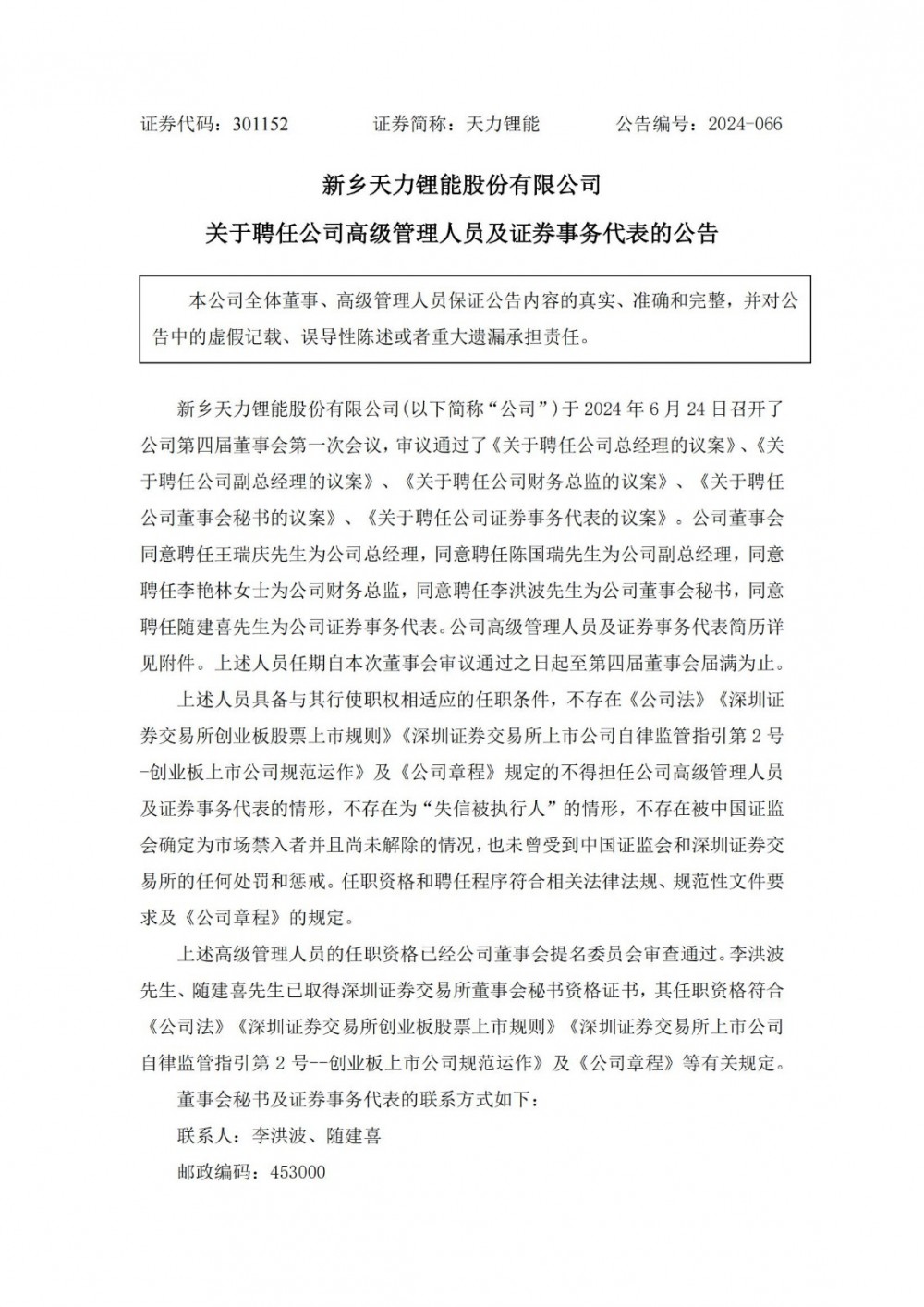 据电力家了解到,6月25日,天力锂能发布公告称,公司召开了公司第四届董事会第一次会议,公司董事会同意聘任王瑞庆先生为公司总经理,同意聘任陈国瑞先生为公司副总经理,同意聘任李艳林女士为公司财务总监,同意聘任李洪波先生为公司董事会秘书,同意聘任随建喜先生为公司证券事务代表。
