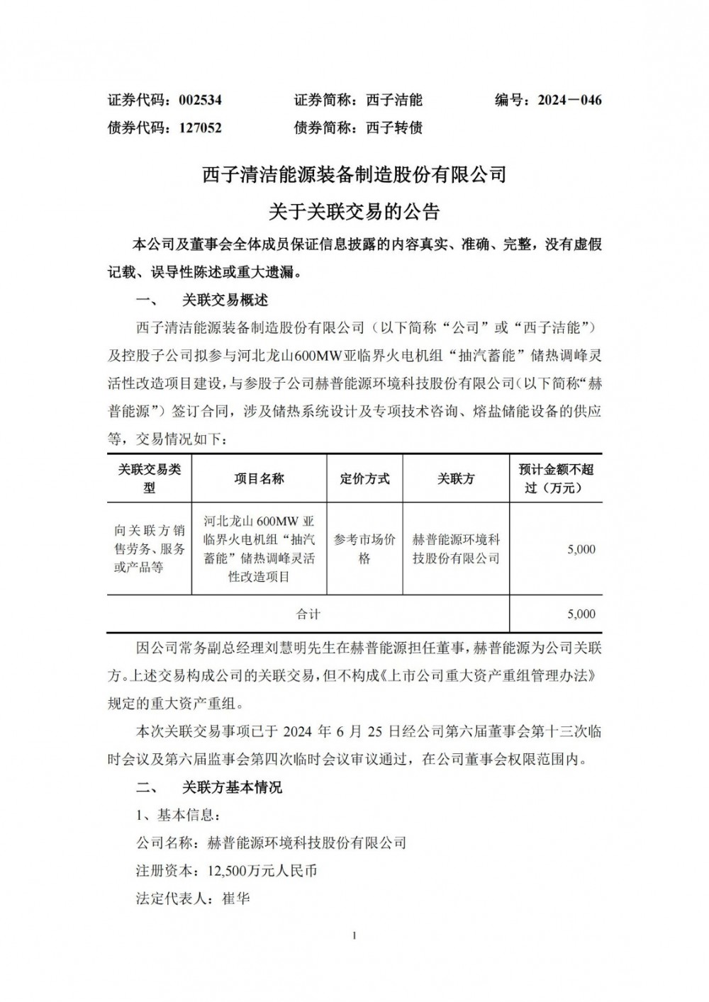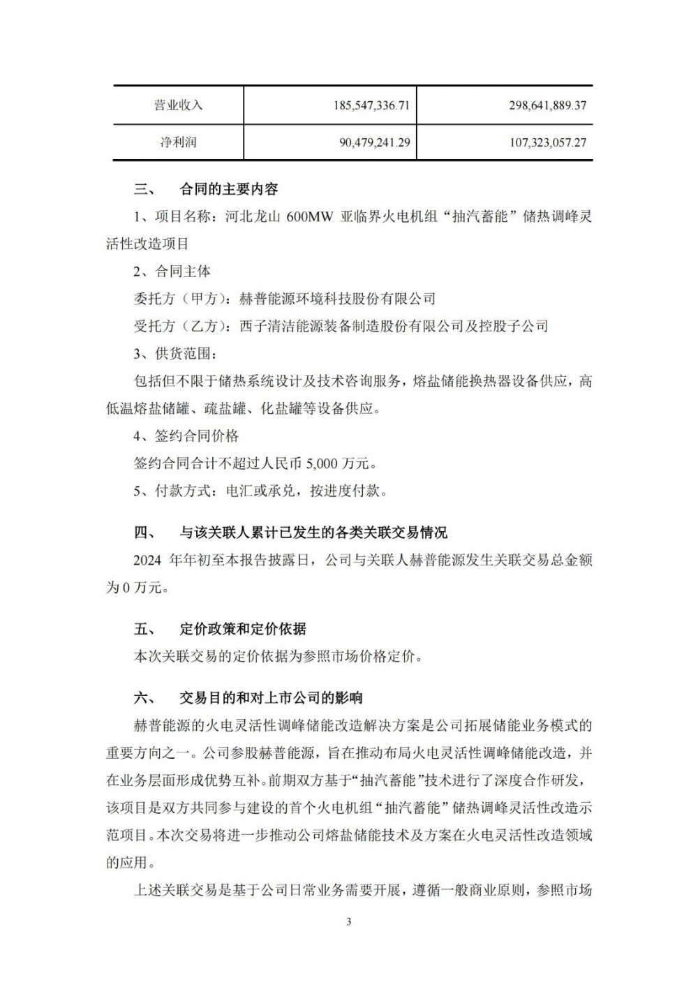 据电力家了解到,6月25日,西子洁能发布公告称,公司及控股子公司拟参与河北龙山600MW亚临界火电机组“抽汽蓄能”储热调峰灵活性改造项目建设,与参股子公司赫普能源环境科技股份有限公司(以下简称“赫普能源”)签订合同,涉及储热系统设计及专项技术咨询、熔盐储能设备的供应等。交易情况如下: