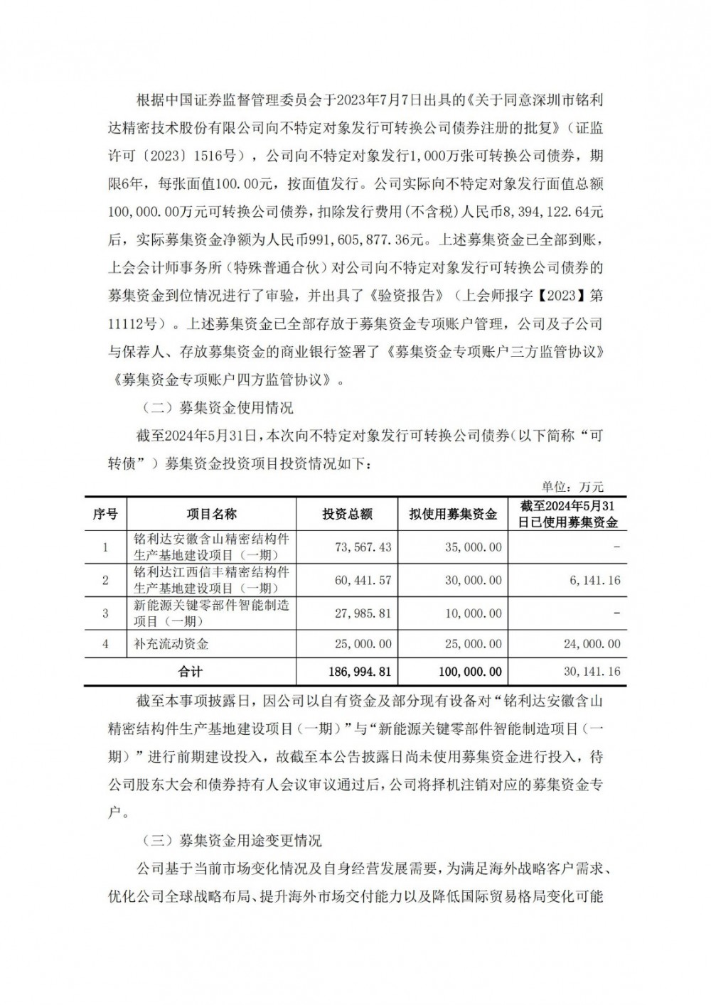 公告显示,“铭利达安徽含山精密结构件生产基地建设项目(一期)”拟在安徽省马鞍山市含山县建设生产基地,提升公司光伏储能结构件和新能源汽车电池托盘结构件产能。截至2024年5月31日,“铭利达安徽含山精密结构件生产基地建设项目(一期)”前期公司投入自有资金1,053.21万元,尚未使用募集资金进行投入,未使用募集资金本金合计35,000.00万元存放于公司募集资金专户。