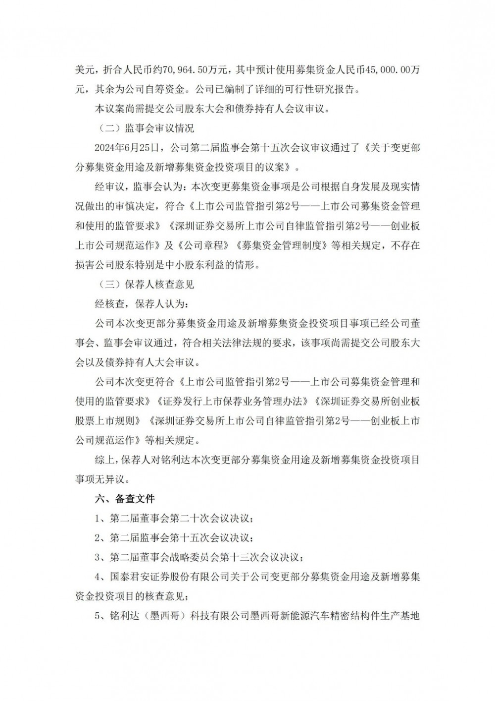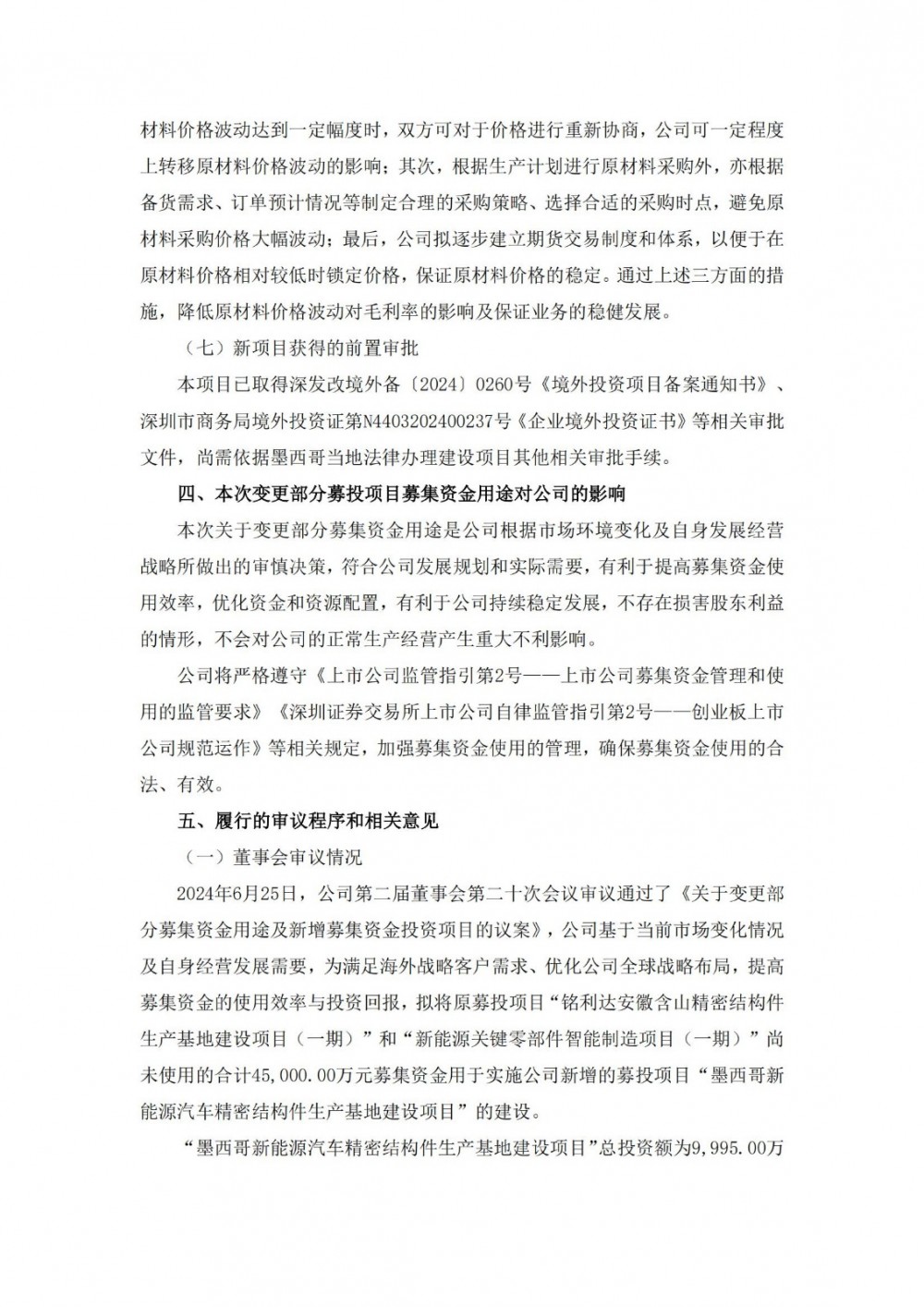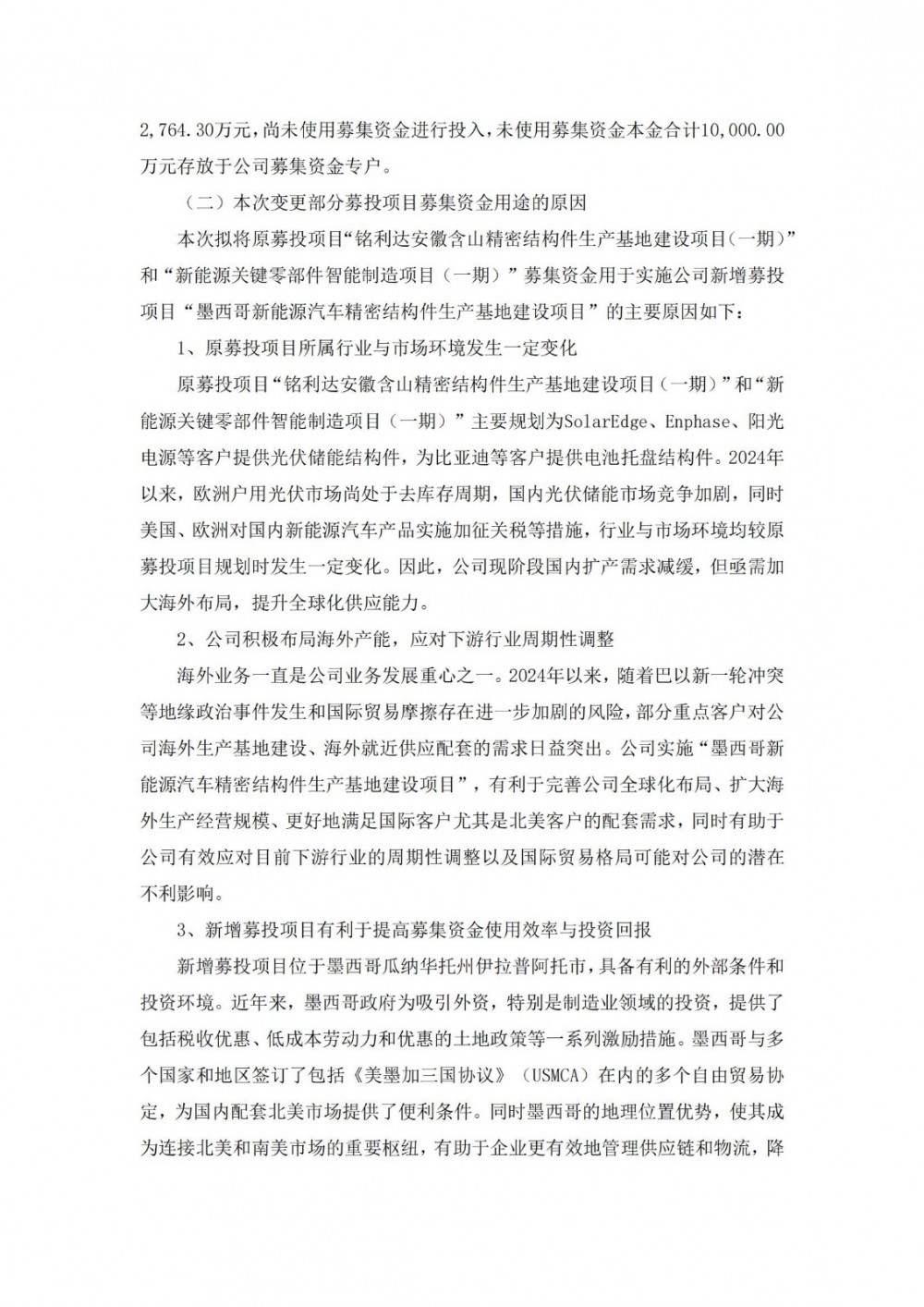 由于2024年以来,欧洲户用光伏市场尚处于去库存周期,国内光伏储能市场竞争加剧,同时美国、欧洲对国内新能源汽车产品实施加征关税等措施,行业与市场环境均较原募投项目规划时发生一定变化。铭利达现阶段国内扩产需求减缓,但亟需加大海外布局,提升全球化供应能力。
