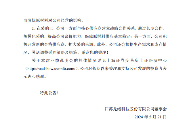 2、在采购上,龙蟠科技一方面与核心供应商建立战略合作关系,通过长期合作、规模化采购,提高公司议价能力,保障原材料供应基本稳定;另一方面,公司积极开发新的合格供应商,扩大采购来源。此外,公司还会根据生产需求和库存情况,灵活调整采购策略及措施。