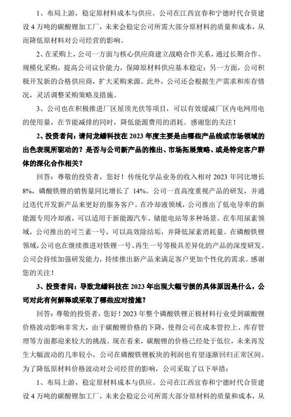 龙蟠科技表示,2023年整个磷酸铁锂正极材料行业受到碳酸锂价格波动影响非常大,由于碳酸锂价格的下降,使得公司在成本管控上、库存管理等方面都迎来较大的挑战。现在看来,碳酸锂的价格已经处于低位,未来再发生大幅波动的几率较小,龙蟠科技在磷酸铁锂板块的利润也有望逐渐回归正常区间。为了降低原材料价格波动对公司经营的影响,龙蟠科技采取了以下举措: