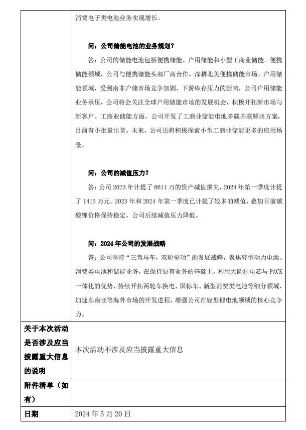 记录表显示,博力威的储能电池包括便携储能、户用储能和小型工商业储能。便携储能领域,公司与便携储能头部厂商合作,深耕北美便携储能市场。户用储能领域,受到南非户储市场竞争加剧,下游库存压力的影响,公司户用储能业务承压,公司将会关注全球户用储能市场的发展机会,积极开拓新市场与新客户。工商业储能方面,公司开发了工商业储能电池多簇并联解决方案,目前有小批量出货。未来,公司还将积极探索小型工商业储能更多的应用场景。