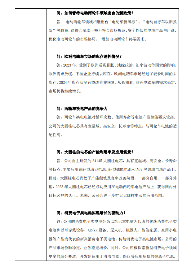 此外,博力威自主研发的34145大圆柱电芯,具有宽温域、高安全、长寿命等特点,主要应用在轻型动力电池、轻型储能电池和AGV等领域电池产品上。目前,大圆柱电芯尚处于产能爬坡及良率改善阶段,一部分自用,一部分外销,2023年大圆柱电芯已经成功应用在电动两轮车电池产品上,获得国内外目标客户的认可。未来,公司会进一步扩大大圆柱电芯的应用范围。